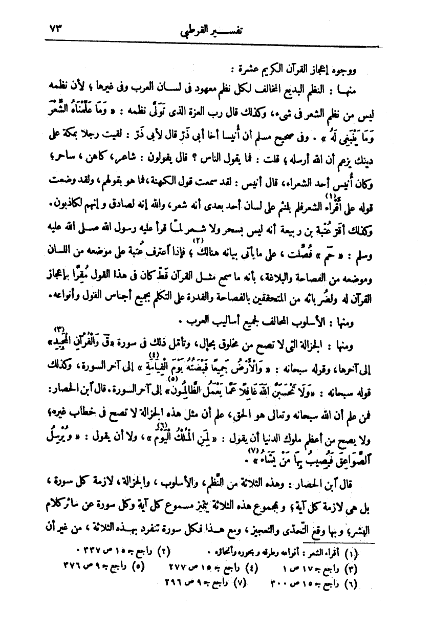 ووجوه إعجاز القرآن عَشْرَةٌ: مِنْهَا النَّظْمُ الْبَدِيعُ الْمُخَالِفُ لِكُلِّ نَظْمٍ مَعْهُودٍ فِي لِسَانِ الْعَرَبِ وَفِي غَيْرِهَا، لِأَنَّ نظمه ليس من نظم الشعر في شي، وَكَذَلِكَ قَالَ رَبُّ الْعِزَّةِ الَّذِي تَوَلَّى نَظْمَهُ:" وَما عَلَّمْناهُ الشِّعْرَ وَما يَنْبَغِي لَهُ". وَفِي صَحِيحِ مُسْلِمٍ أَنَّ أُنَيْسًا أَخَا أَبِي ذَرٍ قَالَ لِأَبِي ذَرٍ: لَقِيتُ رَجُلًا بِمَكَّةَ عَلَى دِينِكَ يَزْعُمُ أَنَّ اللَّهَ أَرْسَلَهُ، قُلْتُ: فَمَا يَقُولُ النَّاسُ؟ قَالَ يَقُولُونَ: شَاعِرٌ، كَاهِنٌ، سَاحِرٌ، وَكَانَ أُنَيْسٌ أَحَدَ الشُّعَرَاءِ، قَالَ أُنَيْسٌ: لَقَدْ سَمِعْتُ قَوْلَ الْكَهَنَةِ، فَمَا هُوَ بِقَوْلِهِمْ، وَلَقَدْ وَضَعْتُ قَوْلَهُ عَلَى أَقْرَاءِ «١» الشِّعْرِ فَلَمْ يَلْتَئِمْ عَلَى لِسَانِ أَحَدٍ بَعْدِي أَنَّهُ شِعْرٌ، وَاللَّهِ إِنَّهُ لَصَادِقٌ وَإِنَّهُمْ لَكَاذِبُونَ. وَكَذَلِكَ أَقَرَّ عُتْبَةُ بْنُ رَبِيعَةَ أَنَّهُ لَيْسَ بِسَحَرٍ وَلَا بشعر لَمَّا قَرَأَ عَلَيْهِ رَسُولُ اللَّهِ صَلَّى اللَّهُ عَلَيْهِ وَسَلَّمَ:" حم" فُصِّلَتْ، عَلَى مَا يَأْتِي بيانه هناك «٢»، فَإِذَا اعْتَرَفَ عُتْبَةُ عَلَى مَوْضِعِهِ مِنَ اللِّسَانِ وموشعه مِنَ الْفَصَاحَةِ وَالْبَلَاغَةِ، بِأَنَّهُ مَا سَمِعَ مِثْلَ الْقُرْآنِ قَطُّ كَانَ فِي هَذَا الْقَوْلِ مُقِرًّا بِإِعْجَازِ الْقُرْآنِ لَهُ وَلِضُرَبَائِهِ مِنَ الْمُتَحَقِّقِينَ بِالْفَصَاحَةِ وَالْقُدْرَةِ عَلَى التَّكَلُّمِ بِجَمِيعِ أَجْنَاسِ الْقَوْلِ وَأَنْوَاعِهِ. وَمِنْهَا: الْأُسْلُوبُ الْمُخَالِفُ لِجَمِيعِ أَسَالِيبِ الْعَرَبِ. وَمِنْهَا: الْجَزَالَةُ الَّتِي لَا تَصِحُّ مِنْ مَخْلُوقٍ بِحَالٍ، وَتَأَمَّلْ ذَلِكَ فِي سُورَةِ" ق وَالْقُرْآنِ الْمَجِيدِ «٣» " إِلَى آخِرِهَا، وَقَوْلُهُ سُبْحَانَهُ:" وَالْأَرْضُ جَمِيعاً قَبْضَتُهُ يَوْمَ الْقِيامَةِ «٤» " إِلَى آخِرِ السُّورَةِ، وَكَذَلِكَ قَوْلُهُ سُبْحَانَهُ:" وَلا تَحْسَبَنَّ اللَّهَ غافِلًا عَمَّا يَعْمَلُ الظَّالِمُونَ «٥» " إِلَى آخِرِ السُّورَةِ. قَالَ ابْنُ الْحَصَّارِ: فَمَنْ عَلِمَ أَنَّ اللَّهَ سُبْحَانَهُ وَتَعَالَى هُوَ الْحَقُّ، عَلِمَ أَنَّ مِثْلَ هَذِهِ الْجَزَالَةِ لَا تَصِحُّ في خطاب غيره،. لا يَصْحُّ مِنْ أَعْظَمِ مُلُوكِ الدُّنْيَا أَنْ يَقُولَ:" لِمَنِ الْمُلْكُ الْيَوْمَ «٦» " وَلَا أَنْ يَقُولَ:" وَيُرْسِلُ الصَّواعِقَ فَيُصِيبُ بِها مَنْ يَشاءُ «٧» ". قَالَ ابْنُ الْحَصَّارِ: وَهَذِهِ الثَّلَاثَةُ مِنَ النَّظْمِ، وَالْأُسْلُوبِ، وَالْجَزَالَةِ، لَازِمَةُ كُلِّ سُورَةٍ، بَلْ هِيَ لَازِمَةُ كُلِّ آيَةٍ، وَبِمَجْمُوعِ هَذِهِ الثَّلَاثَةِ يَتَمَيَّزُ مَسْمُوعُ كُلِّ آيَةٍ وَكُلِّ سُورَةٍ عَنْ سَائِرِ كَلَامِ الْبَشَرِ، وَبِهَا وَقْعُ التَّحَدِّي وَالتَّعْجِيزُ، وَمَعَ هَذَا فَكُلُّ سُورَةٍ تَنْفَرِدُ بِهَذِهِ الثَّلَاثَةِ، مِنْ غير أن