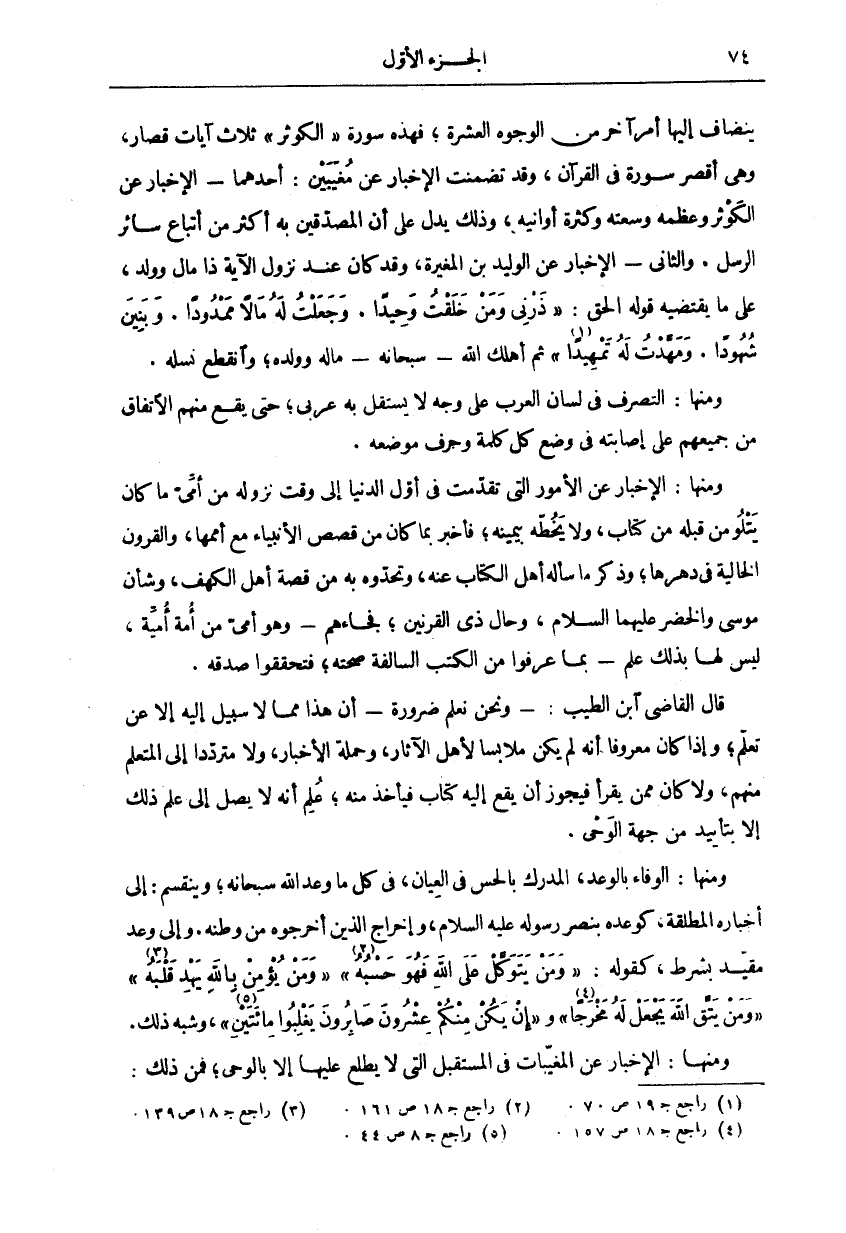 ينضاف إليها أمر آخر من الوجوه العشر: فَهَذِهِ سُورَةُ" الْكَوْثَرِ" ثَلَاثُ آيَاتٍ قِصَارٍ، وَهِيَ أَقْصَرُ سُورَةٍ فِي الْقُرْآنِ، وَقَدْ تَضَمَّنَتِ الْإِخْبَارَ عَنْ مُغَيَّبَيْنِ: أَحَدُهُمَا الْإِخْبَارُ عَنِ الْكَوْثَرِ وَعِظَمِهِ وَسِعَتِهِ وَكَثْرَةِ أَوَانِيهِ، وَذَلِكَ يَدُلُّ عَلَى أَنَّ الْمُصَدِّقِينَ بِهِ أَكْثَرُ مِنْ أَتْبَاعِ سَائِرِ الرُّسُلِ. وَالثَّانِي الْإِخْبَارُ عَنِ الْوَلِيدِ بْنِ الْمُغِيرَةِ، وَقَدْ كَانَ عِنْدَ نُزُولِ الْآيَةِ ذَا مَالٍ وَوَلَدٍ، عَلَى مَا يَقْتَضِيهِ قَوْلُهُ الْحَقُّ:" ذَرْنِي وَمَنْ خَلَقْتُ وَحِيداً. وَجَعَلْتُ لَهُ مَالًا مَمْدُوداً. وَبَنِينَ شُهُوداً. وَمَهَّدْتُ لَهُ تَمْهِيداً «١» " ثُمَّ أهلك الله سبحان مَالَهُ وَوَلَدَهُ، وَانْقَطَعَ نَسْلُهُ. وَمِنْهَا التَّصَرُّفُ فِي لِسَانِ الْعَرَبِ عَلَى وَجْهٍ لَا يَسْتَقِلُّ بِهِ عَرَبِيٌّ، حَتَّى يَقَعَ مِنْهُمُ الِاتِّفَاقُ مِنْ جَمِيعِهِمْ عَلَى إِصَابَتِهِ فِي وَضْعِ كُلِّ كَلِمَةٍ وَحَرْفٍ مَوْضِعَهُ. وَمِنْهَا: الْإِخْبَارُ عَنِ الْأُمُورِ الَّتِي تَقَدَّمَتْ في أول الدنيا إلى وقت تزوله مِنْ أُمِّيٍّ مَا كَانَ يَتْلُو مِنْ قَبْلِهِ مِنْ كِتَابٍ، وَلَا يَخُطُّهُ بِيَمِينِهِ، فَأَخْبَرَ بِمَا كَانَ مِنْ قِصَصِ الْأَنْبِيَاءِ مَعَ أُمَمِهَا، وَالْقُرُونِ الْخَالِيَةِ فِي دَهْرِهَا، وَذَكَرَ مَا سَأَلَهُ أَهْلُ الكتاب عنه، وتحدوه به من قصص أَهْلِ الْكَهْفِ، وَشَأْنِ مُوسَى وَالْخَضِرِ عَلَيْهِمَا السَّلَامُ، وَحَالِ ذِي الْقَرْنَيْنِ، فَجَاءَهُمْ وَهُوَ أُمِّيٌّ مِنْ أُمَّةٍ أُمِّيَّةٍ، لَيْسَ لَهَا بِذَلِكَ عِلْمٌ بِمَا عَرَفُوا مِنَ الْكُتُبِ السَّالِفَةِ صِحَّتَهُ، فَتَحَقَّقُوا صِدْقَهُ. قَالَ الْقَاضِي ابْنُ الطَّيِّبِ: وَنَحْنُ نَعْلَمُ ضَرُورَةَ أَنَّ هَذَا مِمَّا لَا سَبِيلَ إِلَيْهِ إِلَّا عن تعلم، وإذا كَانَ مَعْرُوفًا أَنَّهُ لَمْ يَكُنْ مُلَابِسًا لِأَهْلِ الآثار، وحملة، الأخبار، والا مترددا إلى المتعلم منهم، ولا كان منن يَقْرَأُ فَيَجُوزُ أَنْ يَقَعَ إِلَيْهِ كِتَابٌ فَيَأْخُذُ منه، علم أَنَّهُ لَا يَصِلُ إِلَى عِلْمِ ذَلِكَ إِلَّا بِتَأْيِيدٍ مِنْ جِهَةِ الْوَحْيِ. وَمِنْهَا: الْوَفَاءُ بِالْوَعْدِ، المدرك بالحسن فِي الْعَيَانِ، فِي كُلِّ مَا وَعَدَ اللَّهُ سبحان، وَيَنْقَسِمُ: إِلَى أَخْبَارِهِ الْمُطْلَقَةِ، كَوَعْدِهِ بِنَصْرِ رَسُولِهِ عَلَيْهِ السَّلَامُ، وَإِخْرَاجِ الَّذِينَ أَخْرَجُوهُ مَنْ وَطَنِهِ. وإلى مُقَيَّدٍ بِشَرْطٍ، كَقَوْلِهِ:" وَمَنْ يَتَوَكَّلْ عَلَى اللَّهِ فَهُوَ حَسْبُهُ «٢» " ... " وَمَنْ يُؤْمِنْ بِاللَّهِ يَهْدِ قَلْبَهُ «٣» " ... " وَمَنْ يَتَّقِ اللَّهَ يَجْعَلْ لَهُ مَخْرَجاً «٤» " وَ" إِنْ يَكُنْ مِنْكُمْ عِشْرُونَ صابِرُونَ يَغْلِبُوا مِائَتَيْنِ «٥»، وَشِبْهُ ذَلِكَ وَمِنْهَا: الْإِخْبَارُ عَنِ الْمُغَيَّبَاتِ فِي الْمُسْتَقْبَلِ الَّتِي لَا يَطَّلِعُ عَلَيْهَا إِلَّا بِالْوَحْيِ، فمن ذلك: