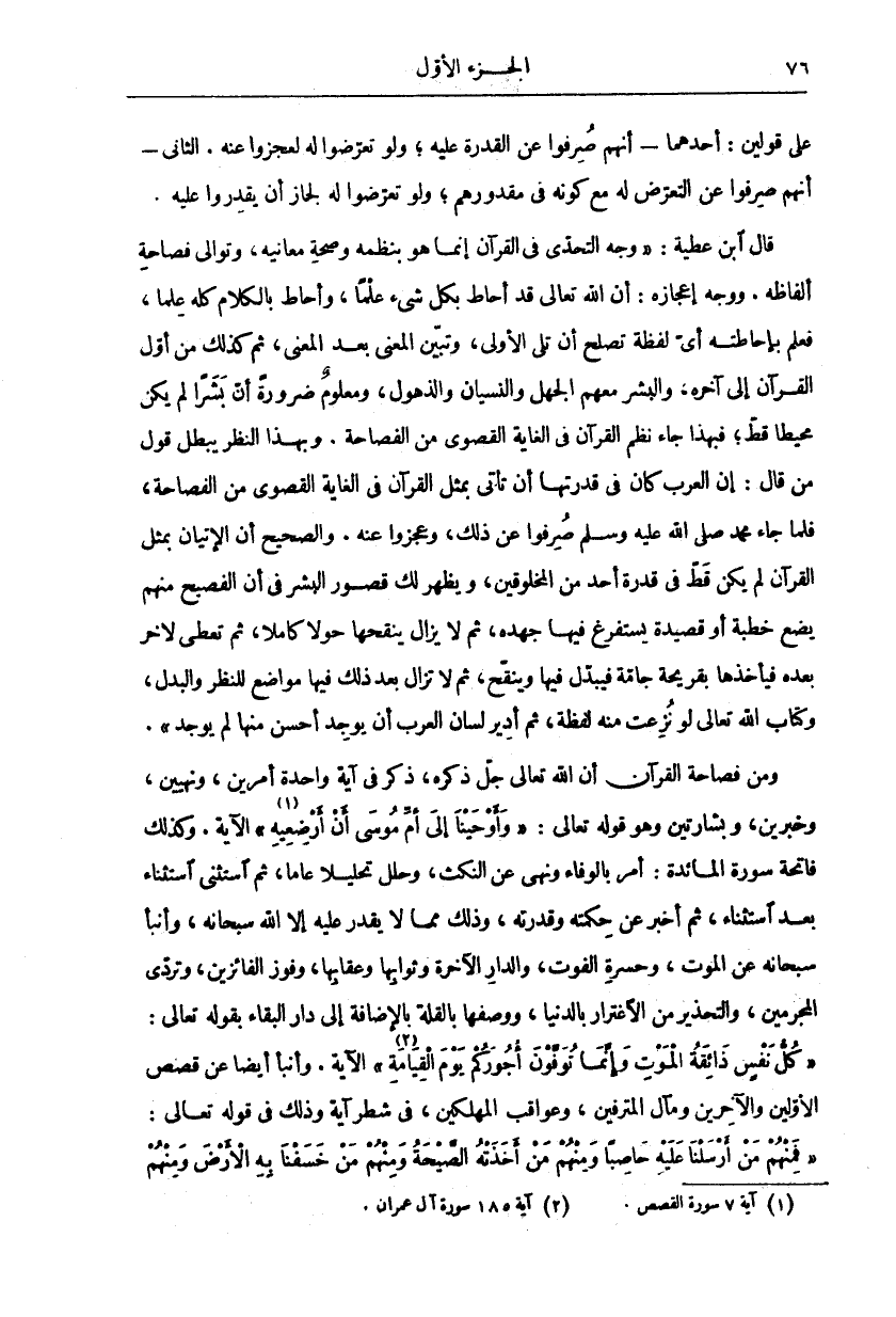 على قولين: أحدهما: أنهم صرفوا على الْقُدْرَةِ عَلَيْهِ، وَلَوْ تَعَرَّضُوا لَهُ لَعَجَزُوا عَنْهُ. الثَّانِي أَنَّهُمْ صُرِفُوا عَنِ التَّعَرُّضِ لَهُ مَعَ كَوْنِهِ فِي مَقْدُورِهِمْ، وَلَوْ تَعَرَّضُوا لَهُ لَجَازَ أَنْ يَقْدِرُوا عَلَيْهِ. قَالَ ابْنُ عَطِيَّةَ:" وَجْهُ التَّحَدِّي فِي الْقُرْآنِ إِنَّمَا هُوَ بِنَظْمِهِ وَصِحَّةِ مَعَانِيهِ، وَتَوَالِي فَصَاحَةِ أَلْفَاظِهِ. وَوَجْهُ إِعْجَازِهِ: أَنَّ اللَّهَ تَعَالَى قَدْ أَحاطَ بِكُلِّ شَيْءٍ عِلْماً، وَأَحَاطَ بِالْكَلَامِ كُلِّهِ عِلْمًا، فَعَلِمَ بِإِحَاطَتِهِ أَيَّ لَفْظَةٍ تَصْلُحُ أَنْ تَلِيَ الْأُولَى، وَتُبَيِّنَ الْمَعْنَى بَعْدَ الْمَعْنَى، ثُمَّ كَذَلِكَ مِنْ أَوَّلِ الْقُرْآنِ إِلَى آخِرِهِ، وَالْبَشَرُ مَعَهُمُ الْجَهْلُ وَالنِّسْيَانُ وَالذُّهُولُ، وَمَعْلُومٌ ضَرُورَةً أَنَّ بَشَرًا لَمْ يَكُنْ مُحِيطًا قط، بهذا جَاءَ نَظْمُ الْقُرْآنِ فِي الْغَايَةِ الْقُصْوَى مِنَ الفصاحة. وبهذا النظر يبطل قوال مَنْ قَالَ: إِنَّ الْعَرَبَ كَانَ فِي قُدْرَتِهَا أَنْ تَأْتِيَ بِمِثْلِ الْقُرْآنِ فِي الْغَايَةِ الْقُصْوَى مِنَ الْفَصَاحَةِ، فَلَمَّا جَاءَ مُحَمَّدٌ صَلَّى اللَّهُ عَلَيْهِ وَسَلَّمَ صُرِفُوا عَنْ ذَلِكَ، وَعَجَزُوا عَنْهُ. وَالصَّحِيحُ أَنَّ الْإِتْيَانَ بِمِثْلِ الْقُرْآنِ لَمْ يَكُنْ قَطُّ فِي قُدْرَةِ أَحَدٍ مِنَ الْمَخْلُوقِينَ، وَيَظْهَرُ لَكَ قُصُورُ الْبَشَرِ فِي أَنَّ الْفَصِيحَ مِنْهُمْ يَضَعُ خُطْبَةً أَوْ قَصِيدَةً يَسْتَفْرِغُ فِيهَا جُهْدَهُ، ثُمَّ لَا يَزَالُ يُنَقِّحُهَا حَوْلًا كَامِلًا، ثُمَّ تُعْطَى لِآخَرَ بَعْدَهُ فَيَأْخُذُهَا بِقَرِيحَةٍ جَامَّةٍ فَيُبَدِّلُ فِيهَا وَيُنَقِّحُ، ثُمَّ لَا تَزَالُ بَعْدَ ذَلِكَ فيها مواضيع لِلنَّظَرِ وَالْبَدَلِ، وَكِتَابُ اللَّهِ تَعَالَى لَوْ نُزِعَتْ مِنْهُ لَفْظَةٌ، ثُمَّ أُدِيرَ لِسَانُ الْعَرَبِ أَنْ يُوجَدَ أَحْسَنَ مِنْهَا لَمْ يُوجِدْ". وَمِنْ فَصَاحَةِ القرآن أن اله تَعَالَى جَلَّ ذِكْرِهِ، ذَكَرَ فِي آيَةٍ وَاحِدَةٍ أَمْرَيْنِ، وَنَهْيَيْنِ، وَخَبَرَيْنِ، وَبِشَارَتَيْنِ وَهُوَ قَوْلُهُ تَعَالَى:" وَأَوْحَيْنا إِلى أُمِّ مُوسى أَنْ أَرْضِعِيهِ «١» الْآيَةَ. وَكَذَلِكَ فَاتِحَةِ سُورَةِ الْمَائِدَةِ: أَمْرٌ بِالْوَفَاءِ وَنَهْيٌ عَنِ النَّكْثِ، وَحَلَّلَ تَحْلِيلًا عَامًا، ثُمَّ اسْتَثْنَى اسْتِثْنَاءً بَعْدَ اسْتِثْنَاءٍ، ثُمَّ أَخْبَرَ عَنْ حِكْمَتِهِ وَقَدْرَتِهِ، وَذَلِكَ مِمَّا لَا يَقْدِرُ عَلَيْهِ إِلَّا اللَّهُ سُبْحَانَهُ، وَأَنْبَأَ سُبْحَانَهُ عَنِ الْمَوْتِ، وَحَسْرَةِ الْفَوْتِ، وَالدَّارِ الْآخِرَةِ وَثَوَابِهَا وَعِقَابِهَا، وَفَوْزِ الْفَائِزِينَ، وَتَرَدِّي الْمُجْرِمِينَ، وَالتَّحْذِيرِ مِنَ الِاغْتِرَارِ بِالدُّنْيَا، وَوَصْفِهَا بِالْقِلَّةِ بِالْإِضَافَةِ إِلَى دَارِ الْبَقَاءِ بِقَوْلِهِ تَعَالَى:" كُلُّ نَفْسٍ ذائِقَةُ الْمَوْتِ وَإِنَّما تُوَفَّوْنَ أُجُورَكُمْ يَوْمَ الْقِيامَةِ «٢» " الْآيَةَ. وَأَنْبَأَ أَيْضًا عَنْ قَصَصِ الْأَوَّلِينَ وَالْآخِرِينَ وَمَآلِ الْمُتْرَفِينَ، وَعَوَاقِبِ الْمُهْلِكِينَ، فِي شَطْرِ آيَةٍ وَذَلِكَ فِي قَوْلِهِ تَعَالَى:" فَمِنْهُمْ مَنْ أَرْسَلْنا عَلَيْهِ حاصِباً وَمِنْهُمْ مَنْ أَخَذَتْهُ الصَّيْحَةُ وَمِنْهُمْ مَنْ خَسَفْنا بِهِ الْأَرْضَ وَمِنْهُمْ مَنْ أَغْرَقْنا