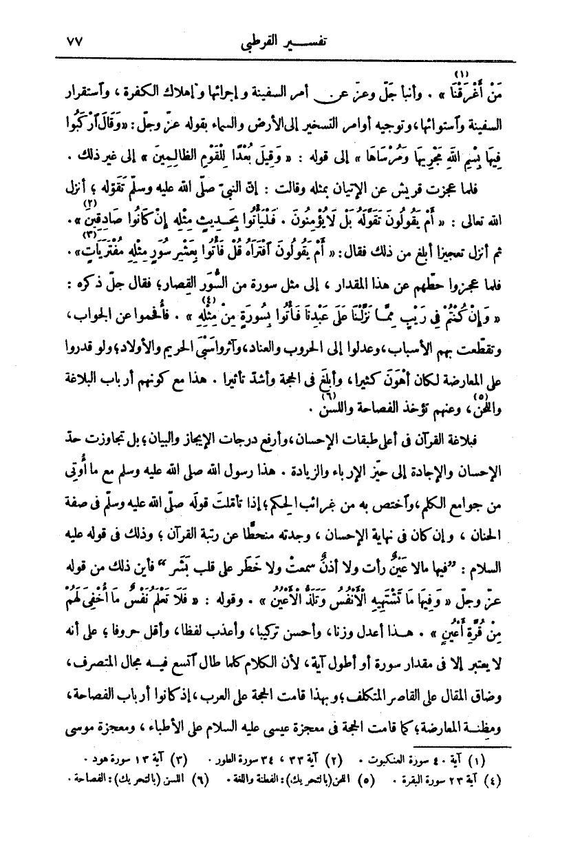 «١» ". وَأَنْبَأَ جَلَّ وَعَزَّ عَنْ أَمْرِ السَّفِينَةِ وَإِجْرَائِهَا وَإِهْلَاكِ الْكَفَرَةِ، وَاسْتِقْرَارِ السَّفِينَةِ وَاسْتِوَائِهَا، وَتَوْجِيهِ أَوَامِرِ التَّسْخِيرِ إِلَى الْأَرْضِ وَالسَّمَاءِ بِقَوْلِهِ عَزَّ وَجَلَّ" وَقالَ ارْكَبُوا فِيها بِسْمِ اللَّهِ مَجْراها وَمُرْساها" الى قوله:" وَقِيلَ بُعْداً لِلْقَوْمِ الظَّالِمِينَ" إِلَى غَيْرِ ذَلِكَ. فَلَمَّا عَجَزَتْ قُرَيْشٌ عَنِ الْإِتْيَانِ بِمِثْلِهِ وَقَالَتْ: إِنَّ النَّبِيَّ صَلَّى اللَّهُ عَلَيْهِ وَسَلَّمَ تَقَوَّلَهُ، أَنْزَلَ اللَّهُ تَعَالَى:" أَمْ يَقُولُونَ تَقَوَّلَهُ بَلْ لَا يُؤْمِنُونَ. فَلْيَأْتُوا بِحَدِيثٍ مِثْلِهِ إِنْ كانُوا صادِقِينَ «٢» ". ثُمَّ أَنْزَلَ تَعْجِيزًا أَبْلَغَ مِنْ ذَلِكَ فَقَالَ:" أَمْ يَقُولُونَ افْتَراهُ قُلْ فَأْتُوا بِعَشْرِ سُوَرٍ مِثْلِهِ مُفْتَرَياتٍ «٣» ". فَلَمَّا عَجَزُوا حَطَّهُمْ عَنْ هَذَا الْمِقْدَارِ، إِلَى مِثْلِ سُورَةٍ مِنَ السُّورِ الْقِصَارِ، فَقَالَ جَلَّ ذِكْرُهُ:" وَإِنْ كُنْتُمْ فِي رَيْبٍ مِمَّا نَزَّلْنا عَلى عَبْدِنا فَأْتُوا بِسُورَةٍ مِنْ مِثْلِهِ «٤» ". فَأُفْحِمُوا عَنِ الْجَوَابِ، وَتَقَطَّعَتْ بِهِمُ الْأَسْبَابُ، وَعَدَلُوا إِلَى الْحُرُوبِ وَالْعِنَادِ، وَآثَرُوا سَبْيَ الْحَرِيمِ وَالْأَوْلَادِ، وَلَوْ قَدَرُوا عَلَى الْمُعَارَضَةِ لَكَانَ أَهْوَنَ كَثِيرًا، وَأَبْلَغَ فِي الْحُجَّةِ وَأَشَدَّ تَأْثِيرًا. هَذَا مَعَ كَوْنِهِمْ أَرْبَابَ الْبَلَاغَةِ وَاللَّحْنِ «٥»، وَعَنْهُمْ تُؤْخَذُ الْفَصَاحَةُ وَاللَّسَنُ «٦». فَبَلَاغَةُ الْقُرْآنِ فِي أَعْلَى طَبَقَاتِ الْإِحْسَانِ، وَأَرْفَعِ دَرَجَاتِ الْإِيجَازِ وَالْبَيَانِ، بَلْ تَجَاوَزَتْ حَدَّ الْإِحْسَانِ وَالْإِجَادَةِ إِلَى حَيِّزِ الْإِرْبَاءِ وَالزِّيَادَةِ. هَذَا رَسُولُ اللَّهِ صَلَّى اللَّهُ عَلَيْهِ وَسَلَّمَ مَعَ مَا أُوتِيَ مِنْ جَوَامِعِ الْكَلِمِ، وَاخْتُصَّ بِهِ مِنْ غَرَائِبِ الْحِكَمِ، إِذَا تَأَمَّلْتَ قَوْلَهُ صَلَّى اللَّهُ عَلَيْهِ وَسَلَّمَ فِي صِفَةِ الْجِنَانِ، وَإِنْ كَانَ فِي نِهَايَةِ الْإِحْسَانِ، وَجَدْتَهُ مُنْحَطًّا عَنْ رُتْبَةِ الْقُرْآنِ، وَذَلِكَ فِي قَوْلِهِ عَلَيْهِ السَّلَامُ:" فيها مالا عَيْنٌ رَأَتْ وَلَا أُذُنٌ سَمِعَتْ وَلَا خَطَرَ عَلَى قَلْبِ بَشَرٍ فَأَيْنَ ذَلِكَ مِنْ قَوْلِهِ عَزَّ وَجَلَّ" وَفِيها مَا تَشْتَهِيهِ الْأَنْفُسُ وَتَلَذُّ الْأَعْيُنُ". وَقَوْلُهُ" فَلا تَعْلَمُ نَفْسٌ مَا أُخْفِيَ لَهُمْ مِنْ قُرَّةِ أَعْيُنٍ". هَذَا أَعْدَلُ وَزْنًا، وَأَحْسَنُ تَرْكِيبًا، وَأَعْذَبُ لَفَظًا، وَأَقَلُّ حُرُوفًا، عَلَى أَنَّهُ لَا يُعْتَبَرُ إِلَّا فِي مِقْدَارِ سُورَةٍ أَوْ أَطْوَلِ آيَةٍ، لِأَنَّ الْكَلَامَ كُلَّمَا طَالَ اتَّسَعَ فِيهِ مَجَالُ الْمُتَصَرِّفِ، وَضَاقَ الْمَقَالُ عَلَى الْقَاصِرِ الْمُتَكَلِّفِ، وَبِهَذَا قَامَتِ الْحُجَّةُ عَلَى الْعَرَبِ، إِذْ كَانُوا أَرْبَابَ الْفَصَاحَةِ، وَمَظِنَّةَ الْمُعَارَضَةِ، كَمَا قَامَتِ الْحُجَّةُ فِي مُعْجِزَةِ عِيسَى عَلَيْهِ السَّلَامُ عَلَى الْأَطِبَّاءِ، وَمُعْجِزَةِ مُوسَى