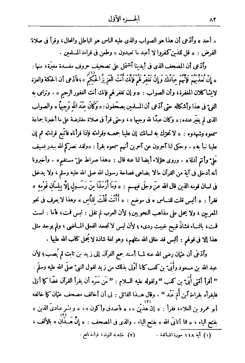 " أَحَدٌ" وادعى أن هذا هو الصواب عَلَيْهِ النَّاسُ هُوَ الْبَاطِلُ وَالْمُحَالُ، وَقَرَأَ فِي صَلَاةِ الْفَرْضِ" قُلْ لِلَّذِينِ كَفَرُوا لَا أَعْبُدُ مَا تَعْبُدُونَ" وَطَعَنَ فِي قِرَاءَةِ الْمُسْلِمِينَ. وَادَّعَى أَنَّ الْمُصْحَفَ الَّذِي فِي أَيْدِينَا اشْتَمَلَ عَلَى تَصْحِيفِ حُرُوفٍ مُفْسِدَةٍ مُغَيَّرَةٍ، مِنْهَا:" إِنْ تُعَذِّبْهُمْ فَإِنَّهُمْ عِبادُكَ وَإِنْ تَغْفِرْ لَهُمْ فَإِنَّكَ أَنْتَ الْعَزِيزُ الْحَكِيمُ «١» " فَادَّعَى أَنَّ الْحِكْمَةَ وَالْعِزَّةَ لَا يُشَاكِلَانِ الْمَغْفِرَةَ، وَأَنَّ الصَّوَابَ:" وَإنْ تَغْفِرْ لَهُمْ فَإِنَّكَ أَنْتَ الْغَفُورُ الرَّحِيمُ". وَتَرَامَى بِهِ الْغَيُّ فِي هَذَا وَأَشْكَالِهِ حَتَّى ادَّعَى أَنَّ الْمُسْلِمِينَ يُصَحِّفُونَ:" وَكانَ عِنْدَ اللَّهِ وَجِيهاً" وَالصَّوَابُ الَّذِي لَمْ يُغَيَّرْ عِنْدَهُ:" وَكَانَ عَبْدًا لِلَّهِ وَجِيهًا"، وَحَتَّى قَرَأَ فِي صَلَاةٍ مُفْتَرَضَةٍ عَلَى مَا أَخْبَرَنَا جَمَاعَةٌ سَمِعُوهُ وَشَهِدُوهُ:" لَا تُحَرِّكْ بِهِ لِسَانَكَ إِنْ عَلَيْنَا جَمْعَهُ وَقِرَاءَتَهُ فَإِذَا قَرَأْنَاهُ فَاتَّبِعْ قِرَاءَتَهُ ثُمَّ إِنَّ عَلَيْنَا نَبَأً بِهِ". وَحَكَى لَنَا آخَرُونَ عَنْ آخَرِينَ أَنَّهُمْ سَمِعُوهُ يَقْرَأُ:" وَلَقَدْ نَصَرَكُمُ اللَّهُ بِبَدْرٍ بِسَيْفِ عَلِيٍّ وَأَنْتُمْ أَذِلَّةٍ". وَرَوَى هَؤُلَاءِ أَيْضًا لَنَا عَنْهُ قَالَ:" هَذَا صِرَاطُ عَلِيٍّ مُسْتَقِيمٌ". وَأَخْبَرُونَا أَنَّهُ أَدْخَلَ فِي آيَةٍ مِنَ الْقُرْآنِ مَا لَا يُضَاهِي فَصَاحَةَ رَسُولِ اللَّهِ صَلَّى اللَّهُ عَلَيْهِ وَسَلَّمَ، وَلَا يَدْخُلُ فِي لِسَانِ قَوْمِهِ الَّذِينَ قَالَ اللَّهُ عَزَّ وَجَلَّ فِيهِمْ:" وَما أَرْسَلْنا مِنْ رَسُولٍ إِلَّا بِلِسانِ قَوْمِهِ" فَقَرَأَ:" أَلَيْسَ قُلْتَ لِلْنَّاسِ" فِي مَوْضِعِ:" أَأَنْتَ قُلْتَ لِلنَّاسِ" وَهَذَا لَا يُعْرَفُ فِي نَحْوِ الْمُعْرِبِينَ، وَلَا يُحْمَلُ عَلَى مَذَاهِبِ النَّحْوِيِّينَ، لِأَنَّ الْعَرَبَ لَمْ تَقُلْ: لَيْسَ قُمْتَ، فَأَمَّا: لَسْتَ قمت، بالتاء فشاذ قبيح خبيث ردئ، لِأَنَّ لَيْسَ لَا تَجْحَدُ الْفِعْلَ الْمَاضِيَ، وَلَمْ يُوجَدْ مِثْلَ هَذَا إِلَّا فِي قَوْلِهِمْ: أَلَيْسَ قَدْ خَلَقَ اللَّهُ مِثْلَهُمْ، وَهُوَ لُغَةٌ شَاذَّةٌ لَا يُحْمَلُ كِتَابُ اللَّهِ عَلَيْهَا. وَادَّعَى أَنَّ عثمان رضى اله عَنْهُ لَمَّا أَسْنَدَ جَمْعَ الْقُرْآنِ إِلَى زَيْدِ بْنِ ثَابِتٍ لَمْ يُصِبْ، لِأَنَّ عَبْدَ اللَّهِ بْنَ مَسْعُودٍ وَأُبَيَّ بْنَ كَعْبٍ كَانَا أَوْلَى بِذَلِكَ مِنْ زَيْدٍ لِقَوْلِ النَّبِيِّ صَلَّى اللَّهُ عَلَيْهِ وَسَلَّمَ:" أَقْرَأُ أُمَّتِي أُبَيُّ بْنُ كَعْبٍ" وَلِقَوْلِهِ عَلَيْهِ السَّلَامُ:" مَنْ سَرَّهُ أَنْ يَقْرَأَ القرآن غضا كما أنزل فليقرأه بِقِرَاءَةِ ابْنِ أُمِّ عَبْدٍ". وَقَالَ هَذَا الْقَائِلُ: لِي أَنْ أُخَالِفَ مُصْحَفَ عُثْمَانَ كَمَا خَالَفَهُ أَبُو عَمْرِو بْنُ الْعَلَاءِ، فَقَرَأَ:" إِنَّ هَذَيْنِ «٢» "،" فَأَصَّدَّقَ وَأَكُونَ"، وَبَشِّرْ عِبَادِيَ الَّذِينَ" بِفَتْحِ الْيَاءِ،" فَمَا أَتَانِيَ اللَّهُ" بِفَتْحِ الْيَاءِ. وَالَّذِي فِي المصحف:" إِنْ هذانِ «٣» " بالألف،