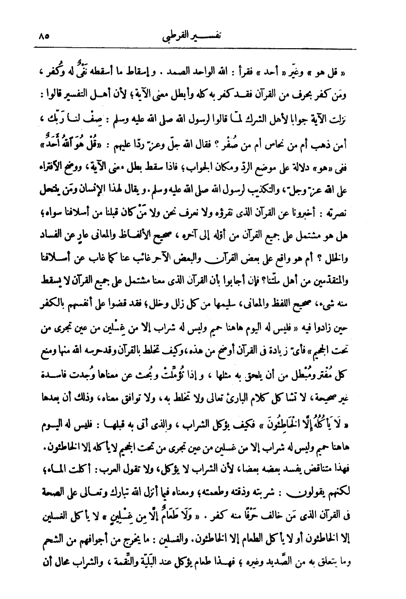 " قُلْ هُوَ" وَغَيَّرَ" أَحَدٌ" فَقَرَأَ: اللَّهُ الْوَاحِدُ الصَّمَدُ. وَإِسْقَاطُ مَا أَسْقَطَهُ نَفْيٌ لَهُ وَكُفْرٌ، وَمَنْ كَفَرَ بِحَرْفٍ مِنَ الْقُرْآنِ فَقَدْ كَفَرَ بِهِ كُلِّهِ وَأَبْطَلَ مَعْنَى الْآيَةِ، لِأَنَّ أَهْلَ التَّفْسِيرِ قَالُوا: نَزَلَتِ الْآيَةُ جَوَابًا لِأَهْلِ الشِّرْكِ لَمَّا قَالُوا لِرَسُولِ اللَّهِ صَلَّى اللَّهُ عَلَيْهِ وَسَلَّمَ: صِفْ لَنَا رَبَّكَ، أَمِنْ ذَهَبٍ أَمْ مِنْ نُحَاسٍ أَمْ مِنْ صُفْرٍ؟ فَقَالَ اللَّهُ جَلَّ وَعَزَّ رَدًّا عَلَيْهِمْ:" قُلْ هُوَ اللَّهُ أَحَدٌ" فَفِي" هُوَ" دَلَالَةٌ عَلَى مَوْضِعِ الرَّدِّ وَمَكَانِ الْجَوَابِ، فَإِذَا سَقَطَ بَطُلَ مَعْنَى الْآيَةِ، وَوَضَحَ الِافْتِرَاءُ عَلَى اللَّهِ عَزَّ وَجَلَّ، وَالتَّكْذِيبُ لِرَسُولِ اللَّهِ صَلَّى اللَّهُ عَلَيْهِ وَسَلَّمَ. وَيُقَالُ لِهَذَا الْإِنْسَانِ وَمَنْ يَنْتَحِلُ نُصْرَتَهُ: أَخْبِرُونَا عَنِ القرآن الذي نقرؤه وَلَا نَعْرِفُ نَحْنُ وَلَا مَنْ كَانَ قَبْلَنَا مِنْ أَسْلَافِنَا سِوَاهُ، هَلْ هُوَ مُشْتَمِلٌ عَلَى جَمِيعِ الْقُرْآنِ مِنْ أَوَّلِهِ إِلَى آخِرِهِ، صَحِيحُ الْأَلْفَاظِ وَالْمَعَانِي عَارٍ عَنِ الْفَسَادِ وَالْخَلَلِ؟ أَمْ هُوَ وَاقِعٌ عَلَى بَعْضِ الْقُرْآنِ وَالْبَعْضِ الْآخَرِ غَائِبٌ عَنَّا كَمَا غَابَ عَنْ أَسْلَافِنَا وَالْمُتَقَدِّمِينَ مِنْ أَهْلِ مِلَّتِنَا؟ فَإِنْ أَجَابُوا بِأَنَّ الْقُرْآنَ الَّذِي مَعَنَا مُشْتَمِلٌ عَلَى جَمِيعِ الْقُرْآنِ لَا يسقط منه شي، صَحِيحُ اللَّفْظِ وَالْمَعَانِي، سَلِيمُهَا مِنْ كُلِّ زَلَلٍ وَخَلَلٍ، فَقَدْ قَضَوْا عَلَى أَنْفُسِهِمْ بِالْكُفْرِ حِينَ زَادُوا فِيهِ" فَلَيْسَ لَهُ الْيَوْمَ هاهُنا حَمِيمٌ وَلَيْسَ لَهُ شَرَابٌ إِلَّا مِنْ غِسْلِينٍ مِنْ عَيْنٍ تَجْرِي مِنْ تَحْتٍ الْجَحِيمِ" فَأَيُّ زِيَادَةٍ فِي الْقُرْآنِ أَوْضَحُ مِنْ هَذِهِ، وَكَيْفَ تُخْلَطُ بِالْقُرْآنِ وَقَدْ حَرَسَهُ اللَّهُ مِنْهَا وَمَنَعَ كُلَّ مُفْتَرٍ وَمُبْطِلٍ مِنْ أَنْ يُلْحِقَ بِهِ مِثْلَهَا، وَإِذَا تُؤُمِّلَتْ وَبُحِثَ عَنْ مَعْنَاهَا وُجِدَتْ فَاسِدَةً غَيْرَ صَحِيحَةٍ، لَا تُشَاكِلُ كَلَامَ الْبَارِي تَعَالَى وَلَا تُخْلَطُ بِهِ، وَلَا تُوَافِقُ مَعْنَاهُ، وَذَلِكَ أن بعدها" لا يَأْكُلُهُ إِلَّا الْخاطِؤُنَ" فَكَيْفَ يُؤْكَلُ الشَّرَابُ، وَالَّذِي أَتَى بِهِ قَبْلَهَا: فَلَيْسَ لَهُ الْيَوْمَ هاهُنا حَمِيمٌ وَلَيْسَ لَهُ شَرَابٌ إِلَّا مِنْ غِسْلِينٍ مِنْ عَيْنٍ تَجْرِي من تحت الجحيم لا يَأْكُلُهُ إِلَّا الْخاطِؤُنَ. فَهَذَا مُتَنَاقِضٌ يُفْسِدُ بَعْضُهُ بَعْضًا، لِأَنَّ الشَّرَابَ لَا يُؤْكَلُ، وَلَا تَقُولُ الْعَرَبُ: أَكَلْتُ الْمَاءَ، لَكِنَّهُمْ يَقُولُونَ: شَرِبْتُهُ وَذُقْتُهُ وَطَعِمْتُهُ