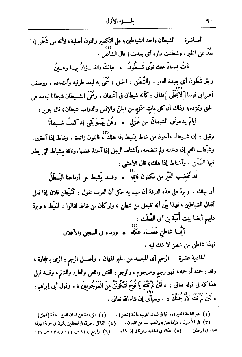 العاشرة الشيطان واتحد الشَّيَاطِينِ، عَلَى التَّكْسِيرِ وَالنُّونُ أَصْلِيَّةٌ، لِأَنَّهُ مِنْ شَطَنَ إِذَا بَعُدَ عَنِ الْخَيْرِ. وَشَطَنَتْ دَارُهُ أي بعدت، قال الشاعر «١»: