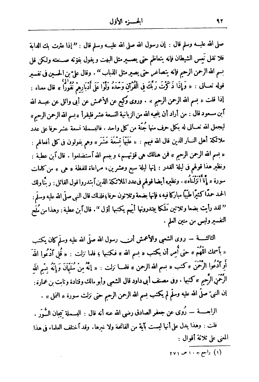 صَلَّى اللَّهُ عَلَيْهِ وَسَلَّمَ قَالَ: إِنَّ رَسُولَ اللَّهِ صَلَّى اللَّهُ عَلَيْهِ وَسَلَّمَ قَالَ:" إِذَا عَثَرَتْ بِكَ الدَّابَّةُ فَلَا تَقُلْ تَعِسَ الشَّيْطَانُ فَإِنَّهُ يَتَعَاظَمُ حَتَّى يَصِيرَ مِثْلَ الْبَيْتِ وَيَقُولُ بقوته صنعته وَلَكِنْ قُلْ بِسْمِ اللَّهِ الرَّحْمَنِ الرَّحِيمِ فَإِنَّهُ يتصاغر حتى مِثْلَ الذُّبَابِ". وَقَالَ عَلِيُّ بْنُ الْحُسَيْنِ فِي تَفْسِيرِ قَوْلِهِ تَعَالَى" وَإِذا ذَكَرْتَ رَبَّكَ فِي الْقُرْآنِ وَحْدَهُ وَلَّوْا عَلى أَدْبارِهِمْ نُفُوراً «١» " قَالَ مَعْنَاهُ: إِذَا قُلْتَ" بِسْمِ اللَّهِ الرَّحْمنِ الرَّحِيمِ". وَرَوَى وَكِيعٌ عَنِ الْأَعْمَشِ عَنْ أَبِي وَائِلٍ عَنْ عَبْدِ اللَّهِ ابن مسعود قل: مَنْ أَرَادَ أَنْ يُنَجِّيَهُ اللَّهُ مِنَ الزَّبَانِيَةِ التِّسْعَةَ عَشَرَ فَلْيَقْرَأْ" بِسْمِ اللَّهِ الرَّحْمنِ الرَّحِيمِ" لِيَجْعَلَ اللَّهُ تَعَالَى لَهُ بِكُلِّ حَرْفٍ مِنْهَا جُنَّةً مِنْ كُلِّ وَاحِدٍ. فَالْبَسْمَلَةُ تِسْعَةَ عَشَرَ حَرْفًا عَلَى عَدَدِ مَلَائِكَةِ أَهْلِ النَّارِ الَّذِينَ قال الله فيهم:" عَلَيْها تِسْعَةَ عَشَرَ" وَهُمْ يَقُولُونَ فِي كُلِّ أَفْعَالِهِمْ:" بِسْمِ اللَّهِ الرَّحْمنِ الرَّحِيمِ" فمن هناك هِيَ قُوَّتُهُمْ، وَبِبِسْمِ اللَّهِ اسْتَضْلَعُوا. قَالَ ابْنُ عَطِيَّةَ: وَنَظِيرُ هَذَا قَوْلُهُمْ فِي لَيْلَةِ الْقَدْرِ: إِنَّهَا لَيْلَةُ سَبْعٍ وَعِشْرِينَ، مُرَاعَاةً لِلَفْظَةِ" هِيَ" من كلمات سورة" إِنَّا أَنْزَلْناهُ" وَنَظِيرُهُ أَيْضًا قَوْلُهُمْ فِي عَدَدِ الْمَلَائِكَةِ الَّذِينَ ابْتَدَرُوا قَوْلُ الْقَائِلِ: رَبَّنَا وَلَكَ الْحَمْدُ حَمْدًا كَثِيرًا طَيِّبًا مُبَارَكًا فِيهِ، فَإِنَّهَا بِضْعَةٌ وَثَلَاثُونَ حَرْفًا، فَلِذَلِكَ قَالَ النَّبِيُّ صَلَّى اللَّهُ عَلَيْهِ وَسَلَّمَ:" لَقَدْ رَأَيْتُ بِضْعًا وَثَلَاثِينَ مَلِكًا يَبْتَدِرُونَهَا أَيُّهُمْ يَكْتُبُهَا أَوَّلُ". قَالَ ابْنُ عَطِيَّةَ: وَهَذَا مِنْ مُلَحِ التَّفْسِيرِ وَلَيْسَ مِنْ مَتِينِ الْعِلْمِ. الثالثة روى الشعبي ولأعمش أن رسول الله صَلَّى اللَّهُ عَلَيْهِ وَسَلَّمَ كَانَ يَكْتُبُ" بِاسْمِكَ اللَّهُمَّ" حَتَّى أُمِرَ أَنْ يُكْتَبَ" بِسْمِ اللَّهِ" فَكَتَبَهَا، فَلَمَّا نَزَلَتْ:" قُلِ ادْعُوا اللَّهَ أَوِ ادْعُوا الرَّحْمنَ" كَتَبَ" بِسْمِ اللَّهِ الرَّحْمَنِ" فَلَمَّا نَزَلَتْ:" إِنَّهُ مِنْ سُلَيْمانَ وَإِنَّهُ بِسْمِ اللَّهِ الرَّحْمنِ الرَّحِيمِ" كَتَبَهَا. وَفِي مُصَنَّفِ أَبِي دَاوُدَ قَالَ الشَّعْبِيُّ وَأَبُو مَالِكٍ وَقَتَادَةُ وَثَابِتُ بْنُ عُمَارَةَ: إِنَّ النبي صلى اله عليه وسلم لم يكتب بسم الله الرحمن الرحيم حَتَّى نَزَلَتْ سُورَةُ" النَّمْلِ". الرَّابِعَةُ رُوِيَ عَنْ جَعْفَرٍ الصَّادِقِ رَضِيَ اللَّهُ عَنْهُ أَنَّهُ قَالَ: الْبَسْمَلَةُ تِيجَانُ السُّوَرِ. قُلْتُ: وَهَذَا يَدُلُّ عَلَى أَنَّهَا لَيْسَتْ بِآيَةٍ مِنَ الْفَاتِحَةِ وَلَا غَيْرِهَا. وقد اختلف العلماء في هذا