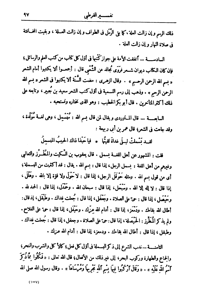 ذَلِكَ الرَّسْمِ وَإِنْ زَالَتِ الْعِلَّةُ، كَمَا بَقِيَ الرَّمَلُ فِي الطَّوَافِ وَإِنْ زَالَتِ الْعِلَّةُ، وَبَقِيَتِ الْمُخَافَتَةُ فِي صَلَاةِ النَّهَارِ وَإِنْ زَالَتِ الْعِلَّةُ. السَّادِسَةُ اتَّفَقَتِ الْأُمَّةُ عَلَى جَوَازِ كَتْبِهَا فِي أول كِتَابٍ مِنْ كُتُبِ الْعِلْمِ وَالرَّسَائِلِ، فَإِنْ كَانَ الكتاب ديوان شعر فر. ى مُجَالِدٌ عَنِ الشَّعْبِيِّ قَالَ: أَجْمَعُوا أَلَّا يَكْتُبُوا أَمَامَ الشِّعْرِ" بِسْمِ اللَّهِ الرَّحْمنِ الرَّحِيمِ". وَقَالَ الزُّهْرِيُّ: مَضَتِ السُّنَّةُ أَلَّا يَكْتُبُوا فِي الشِّعْرِ" بِسْمِ اللَّهِ الرَّحْمنِ الرَّحِيمِ". وَذَهَبَ إِلَى رَسْمِ التَّسْمِيَةِ فِي أَوَّلِ كُتُبِ الشِّعْرِ سَعِيدُ بْنُ جُبَيْرٍ، وَتَابَعَهُ عَلَى ذَلِكَ أَكْثَرُ الْمُتَأَخِّرِينَ. قَالَ أبو بكر الخطيب: هو الَّذِي نَخْتَارُهُ وَنَسْتَحِبُّهُ. السَّابِعَةُ قَالَ الْمَاوَرْدِيُّ وَيُقَالُ لِمَنْ قَالَ بِسْمِ اللَّهِ: مُبَسْمِلٌ، وَهِيَ لُغَةٌ مُوَلَّدَةٌ، وَقَدْ جَاءَتْ فِي الشِّعْرِ، قَالَ عُمَرُ بن أبي ربيعة: