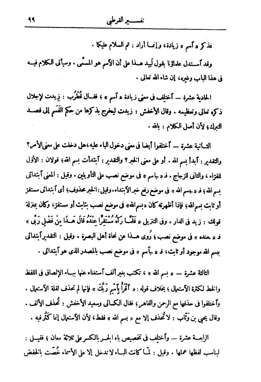 فَذَكَرَ" اسْمَ" زِيَادَةً، وَإِنَّمَا أَرَادَ: ثُمَّ السَّلَامُ عَلَيْكُمَا. وَقَدِ اسْتَدَلَّ عُلَمَاؤُنَا بِقَوْلِ لَبِيَدٍ هَذَا عَلَى أَنَّ الِاسْمَ هُوَ الْمُسَمَّى. وَسَيَأْتِي الْكَلَامُ فيه في هذا الباب وغيره، إ ن شاء الله تعالى. الحادية عشر اخْتُلِفَ فِي مَعْنَى زِيَادَةِ" اسْمِ" فَقَالَ قُطْرُبٌ: زِيدَتْ لِإِجْلَالِ ذِكْرِهِ تَعَالَى وَتَعْظِيمِهِ. وَقَالَ الْأَخْفَشُ: زِيدَتْ لِيَخْرُجَ بِذِكْرِهَا مِنْ حُكْمِ الْقَسَمِ إِلَى قَصْدِ التَّبَرُّكِ، لِأَنَّ أَصْلَ الْكَلَامِ: بِاللَّهِ. الثَّانِيَةَ عشر اخْتَلَفُوا أَيْضًا فِي مَعْنَى دُخُولِ الْبَاءِ عَلَيْهِ، هَلْ دَخَلَتْ عَلَى مَعْنَى الْأَمْرِ؟ وَالتَّقْدِيرُ: ابْدَأْ بِسْمِ اللَّهِ. أَوْ عَلَى مَعْنَى الْخَبَرِ؟ وَالتَّقْدِيرُ: ابتدأت بسم الله، قولان: الأول للقراء، والثاني للزجاج. ف" بسم الله" فِي مَوْضِعِ نَصْبٍ عَلَى التَّأْوِيلَيْنِ. وَقِيلَ: الْمَعْنَى ابْتِدَائِي بِسْمِ اللَّهِ، فَ" بِسْمِ اللَّهِ" فِي مَوْضِعِ رَفْعِ خَبَرِ الِابْتِدَاءِ. وَقِيلَ: الْخَبَرُ مَحْذُوفٌ، أَيِ ابْتِدَائِي مُسْتَقِرٌّ أَوْ ثَابِتٌ بِسْمِ اللَّهِ، فَإِذَا أَظْهَرْتَهُ كَانَ" بِسْمِ اللَّهِ" فِي مَوْضِعِ نَصْبٍ بِثَابِتٍ أَوْ مُسْتَقِرٍّ، وَكَانَ بِمَنْزِلَةِ قَوْلِكَ: زَيْدٌ فِي الدَّارِ. وَفِي التَّنْزِيلِ" فَلَمَّا رَآهُ مُسْتَقِرًّا عِنْدَهُ قالَ هَذَا مِنْ فَضْلِ رَبِّي" فَ" عِنْدَهُ" فِي مَوْضِعِ نَصْبٍ، رُوِيَ هَذَا عَنْ نُحَاةِ أَهْلِ الْبَصْرَةِ. وَقِيلَ التَّقْدِيرُ ابْتِدَائِي بِبِسْمِ اللَّهِ مَوْجُودٌ أَوْ ثَابِتٌ، فَ" بِاسْمِ" فِي مَوْضِعِ نَصْبٍ بِالْمَصْدَرِ الَّذِي هُوَ ابْتِدَائِي. الثالثة عشر" بِسْمِ اللَّهِ"، تُكْتَبُ بِغَيْرِ أَلِفٍ اسْتِغْنَاءً عَنْهَا بِبَاءِ الْإِلْصَاقِ فِي اللَّفْظِ وَالْخَطِّ لِكَثْرَةِ الِاسْتِعْمَالِ، بخلاف قوله:" اقْرَأْ بِاسْمِ رَبِّكَ" فإنها تحذف لقلة الاستعمال .. اختلفوا فِي حَذْفِهَا مَعَ الرَّحْمَنِ وَالْقَاهِرِ، فَقَالَ الْكِسَائِيُّ وَسَعِيدٌ الْأَخْفَشُ: تُحْذَفُ الْأَلِفُ. وَقَالَ يَحْيَى بْنُ وَثَّابٍ: لَا تُحْذَفُ إِلَّا مَعَ" بِسْمِ اللَّهِ" فَقَطْ، لِأَنَّ الِاسْتِعْمَالَ إِنَّمَا كَثُرَ فِيهِ. الرَّابِعَةَ عَشْرَ وَاخْتُلِفَ فِي تَخْصِيصِ بَاءِ الْجَرِّ بِالْكَسْرِ عَلَى ثَلَاثَةِ مَعَانٍ، فَقِيلَ: لِيُنَاسِبَ لَفْظُهَا عَمَلَهَا. وَقِيلَ لَمَّا كَانَتِ الْبَاءُ لَا تَدْخُلُ إِلَّا عَلَى الْأَسْمَاءِ خُصَّتْ بِالْخَفْضِ