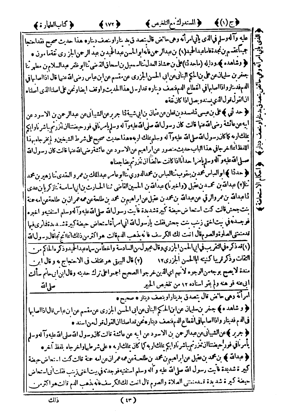 613- مَا حَدَّثَنَا عَلِيُّ بْنُ حَمْشَاذَ الْعَدْلُ ، حَدَّثَنَا إِسْمَاعِيلُ بْنُ إِسْحَاقَ الْقَاضِي ، حَدَّثَنَا أَبُو ظَفَرٍ عَبْدُ السَّلاَمِ بْنُ مُطَهَّرٍ ، حَدَّثَنَا جَعْفَرُ بْنُ سُلَيْمَانَ ، عَنْ عَلِيِّ بْنِ الْحَكَمِ الْبُنَانِيِّ ، عَنْ أَبِي الْحَسَنِ الْجَزَرِيِّ ، عَنْ مِقْسَمٍ ، عَنِ ابْنِ عَبَّاسٍ رَضِيَ اللَّهُ عَنْهُمَا ، قَالَ : إِذَا أَصَابَهَا فِي الدَّمِ فَدِينَارٌ ، وَإِذَا أَصَابَهَا فِي انْقِطَاعِ الدَّمِ فَنِصْفُ دِينَارٍ .