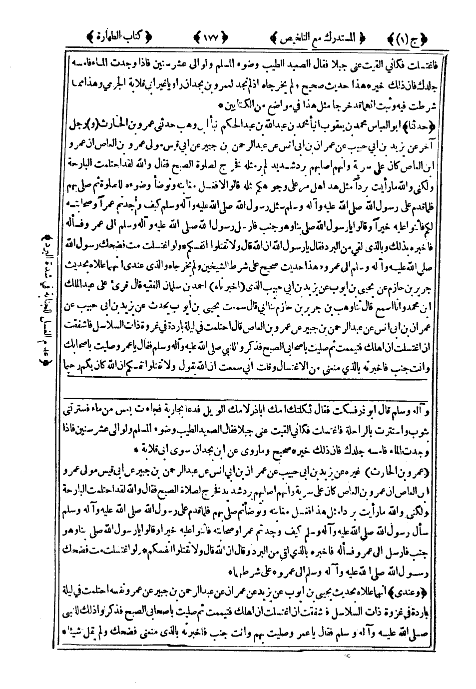 629- أَخْبَرْنَاهُ أَحْمَدُ بْنُ سَلْمَانَ الْفَقِيهُ ، قَالَ : قُرِئَ عَلَى عَبْدِ الْمَلِكِ بْنِ مُحَمَّدٍ وَأَنَا أَسْمَعُ ، قَالَ : حَدَّثَنَا وَهْبُ بْنُ جَرِيرِ بْنِ حَازِمٍ ، حَدَّثَنَا أَبِي ، قَالَ : سَمِعْتُ يَحْيَى بْنَ أَيُّوبَ يُحَدِّثُ ، عَنْ يَزِيدَ بْنِ أَبِي حَبِيبٍ ، عَنْ عِمْرَانَ بْنِ أَبِي أَنَسٍ ، عَنْ عَبْدِ الرَّحْمَنِ بْنِ جُبَيْرٍ ، عَنْ عَمْرِو بْنِ الْعَاصِ ، قَالَ : احْتَلَمَتْ فِي لَيْلَةٍ بَارِدَةٍ فِي غَزْوَةِ ذَاتِ السَّلاَسِلِ فَأَشْفَقْتُ إِنِ اغْتَسَلْتُ أَنْ أَهْلِكَ ، فَتَيَمَّمْتُ ، ثُمَّ صَلَّيْتُ بِأَصْحَابِي الصُّبْحَ ، فَذَكَرُوا لِلنَّبِيِّ صَلَّى اللَّهُ عَلَيْهِ وَسَلَّمَ ، فَقَالَ : يَا عَمْرُو صَلَّيْتَ بِأَصْحَابِكَ وَأَنْتَ جُنُبٌ ؟ فَأَخْبَرْتُهُ بِالَّذِي مَنَعَنِي مِنَ الاِغْتِسَالِ وَقُلْتُ : إِنِّي سَمِعْتُ أَنَّ اللَّهَ يَقُولُ : {وَلاَ تَقْتُلُوا أَنْفُسَكُمْ إِنَّ اللَّهَ كَانَ بِكُمْ رَحِيمًا} فَضَحِكَ رَسُولُ اللهِ صَلَّى اللَّهُ عَلَيْهِ وَسَلَّمَ وَلَمْ يَقُلْ شَيْئًا .