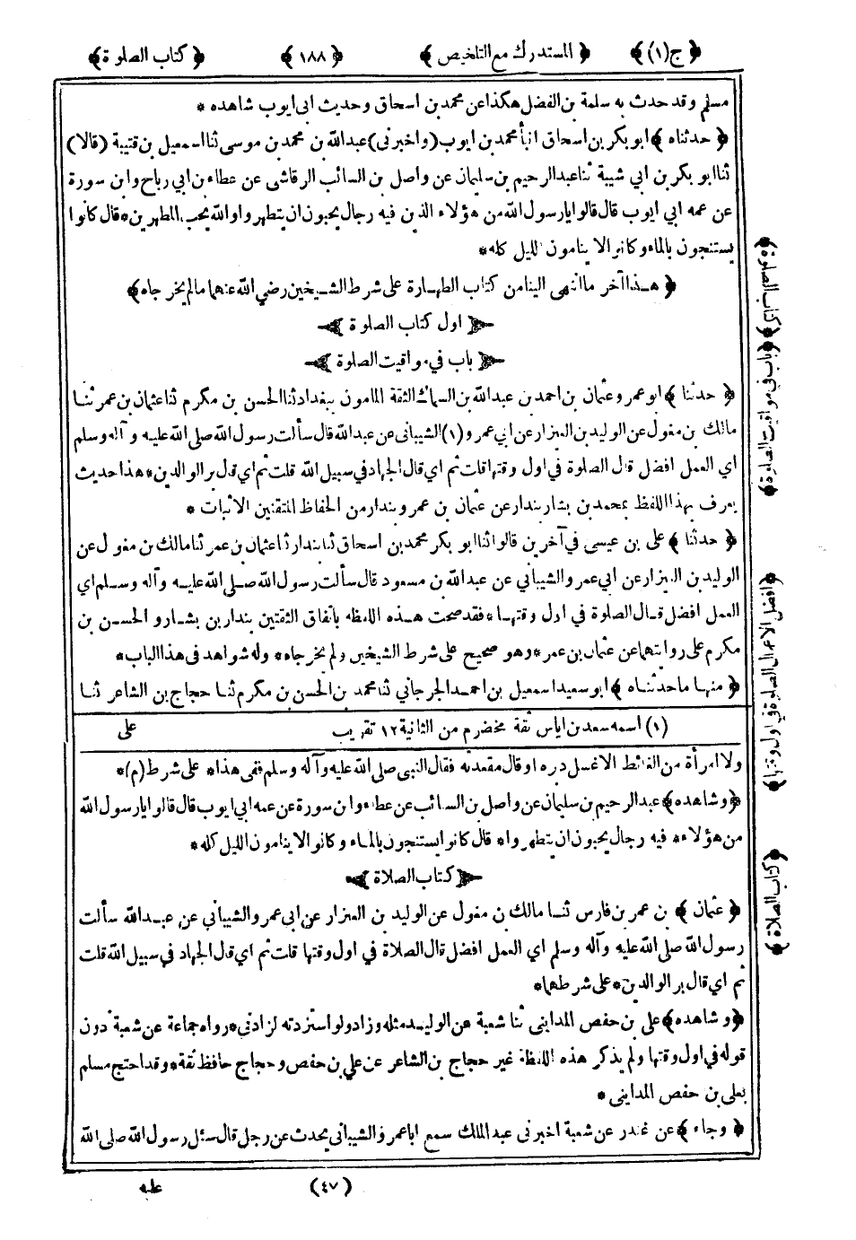 هَذَا آخِرُ مَا انْتَهَى إِلَيْنَا مِنْ كِتَابِ الطَّهَارَةِ عَلَى شَرْطِ الشَّيْخَيْنِ رَضِيَ اللَّهُ عَنْهُمَا مَا لَمْ يُخَرِّجَاهُ. 4- أَوَّلُ كِتَابِ الصَّلاَةِ