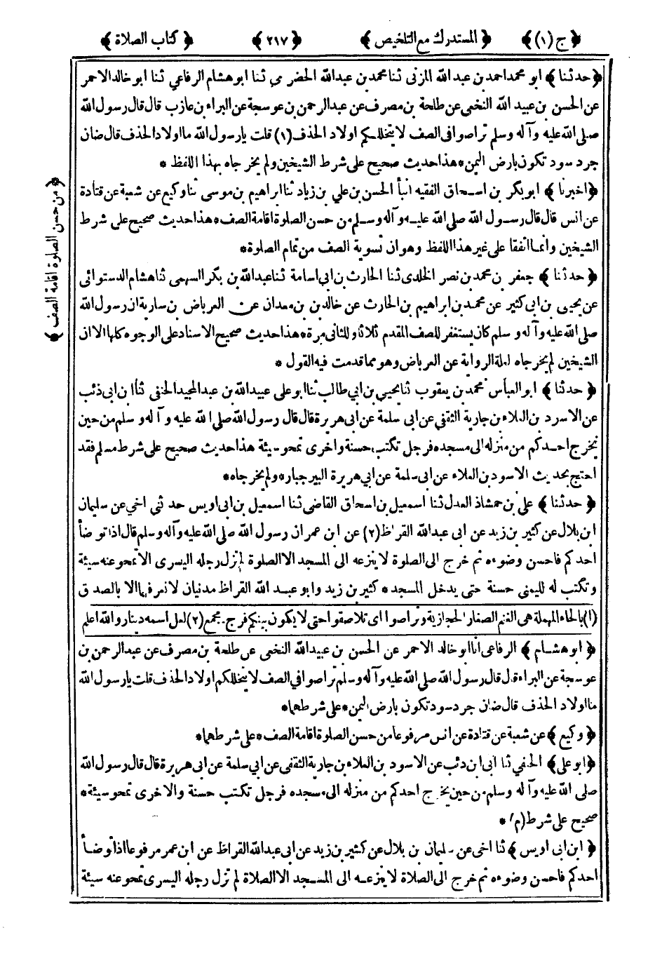 هَذَا حَدِيثٌ صَحِيحٌ عَلَى شَرْطِ الشَّيْخَيْنِ ، وَإِنَّمَا اتَّفَقَا عَلَى غَيْرِ هَذَا اللَّفْظِ ، وَهُوَ أَنَّ تَسْوِيَةَ الصَّفِّ مِنْ تَمَامِ الصَّلاَةِ.