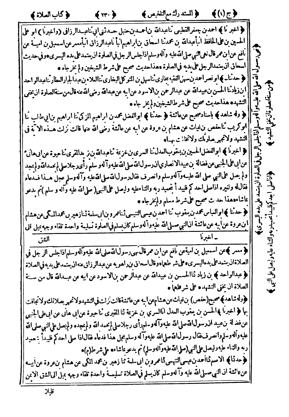 وَفِي حَدِيثِ إِسْحَاقَ : أَنْ يَعْتَمِدَ الرَّجُلُ عَلَى يَدَيْهِ فِي الصَّلاَةِ . هَذَا حَدِيثٌ صَحِيحٌ عَلَى شَرْطِ الشَّيْخَيْنِ وَلَمْ يُخَرِّجَاهُ.