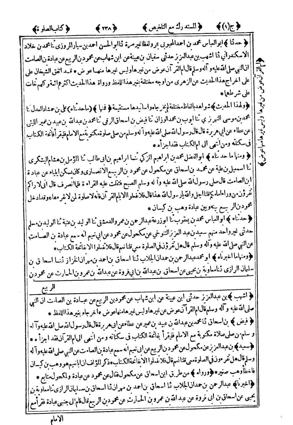 871- مَا أَخْبَرْنَاهُ أَبُو مُحَمَّدٍ عَبْدُ الرَّحْمَنِ بْنُ حَمْدَانَ الْجَلاَبُ ، حَدَّثَنَا إِسْحَاقُ بْنُ أَحْمَدَ بْنِ مِهْرَانَ الْخَزَّارُ ، حَدَّثَنَا إِسْحَاقُ بْنُ سُلَيْمَانَ الرَّازِيُّ ، حَدَّثَنَا مُعَاوِيَةُ بْنُ يَحْيَى ، عَنْ إِسْحَاقَ بْنِ عَبْدِ اللهِ بْنِ أَبِي فَرْوَةَ ، عَنْ عَبْدِ اللهِ بْنِ عَمْرِو بْنِ الْحَارِثِ ، عَنْ مَحْمُودِ بْنِ الرَّبِيعِ الأَنْصَارِيِّ ، قَالَ : قَامَ إِلَى جَنْبِي عُبَادَةُ بْنُ الصَّامِتِ فَقَرَأَ مَعَ الإِمَامِ وَهُوَ يَقْرَأُ ، فَلَمَّا انْصَرَفَ قُلْتُ : يَا أَبَا الْوَلِيدِ ، تَقْرَأُ وَتُسْمِعُ وَهُوَ يَجْهَرُ بِالْقِرَاءَةِ ؟ قَالَ : نَعَمْ ، إِنَّا قَرَأْنَا مَعَ رَسُولِ اللهِ صَلَّى اللَّهُ عَلَيْهِ وَسَلَّمَ فَغَلِطَ رَسُولُ اللهِ صَلَّى اللَّهُ عَلَيْهِ وَسَلَّمَ ثُمَّ سَبَّحَ ، فَقَالَ لَنَا حِينَ انْصَرَفَ : هَلْ قَرَأَ مَعِي أَحَدٌ ؟ قُلْنَا : نَعَمْ ، قَالَ : قَدْ عَجِبْتُ قُلْتُ : مِنْ هَذَا الَّذِي يُنَازِعُنِي الْقُرْآنَ ، إِذَا قَرَأَ الإِمَامُ فَلاَ تَقْرَؤُوا إِلاَّ بِأُمِّ الْقُرْآنِ فَإِنَّهُ لاَ صَلاَةَ لِمَنْ لَمْ يَقْرَأْ بِهَا .