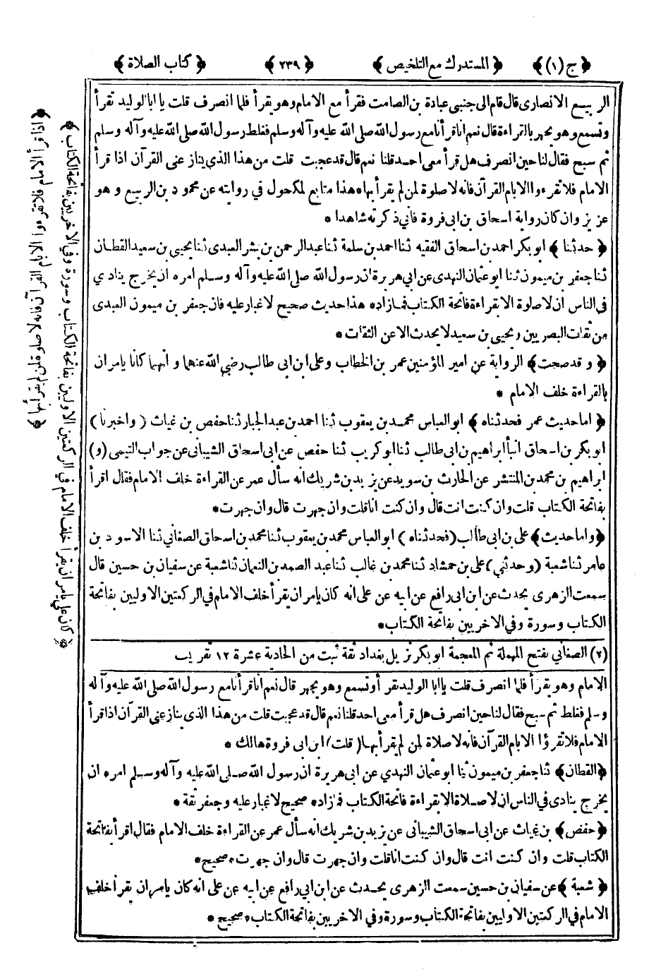 873- فَحَدَّثَنَاهُ أَبُو الْعَبَّاسِ مُحَمَّدُ بْنُ يَعْقُوبَ ، حَدَّثَنَا أَحْمَدُ بْنُ عَبْدِ الْجَبَّارِ ، حَدَّثَنَا حَفْصُ بْنُ غِيَاثٍ ، (ح) وَأَخْبَرَنَا أَبُو بَكْرِ بْنُ إِسْحَاقَ ، أَنْبَأَ إِبْرَاهِيمُ بْنُ أَبِي طَالِبٍ ، حَدَّثَنَا أَبُو كُرَيْبٍ ، حَدَّثَنَا حَفْصٌ ، عَنْ أَبِي إِسْحَاقَ الشَّيْبَانِيِّ ، عَنْ جَوَّابٍ التَّيْمِيِّ ، وَإِبْرَاهِيمَ بْنِ مُحَمَّدِ بْنِ الْمُنْتَشِرِ ، عَنِ الْحَارِثِ بْنِ سُوَيْدٍ ، عَنْ يَزِيدَ بْنِ شَرِيكٍ ، أَنَّهُ سَأَلَ عُمَرَ عَنِ الْقِرَاءَةِ خَلْفَ الإِمَامِ ، فَقَالَ : اقْرَأْ بِفَاتِحَةِ الْكِتَابِ ، قُلْتُ : وَإِنْ كُنْتَ أَنْتَ ؟ قَالَ : وَإِنْ كُنْتُ أَنَا ، قُلْتُ : وَإِنْ جَهَرْتَ ؟ قَالَ : وَإِنْ جَهَرْتُ.