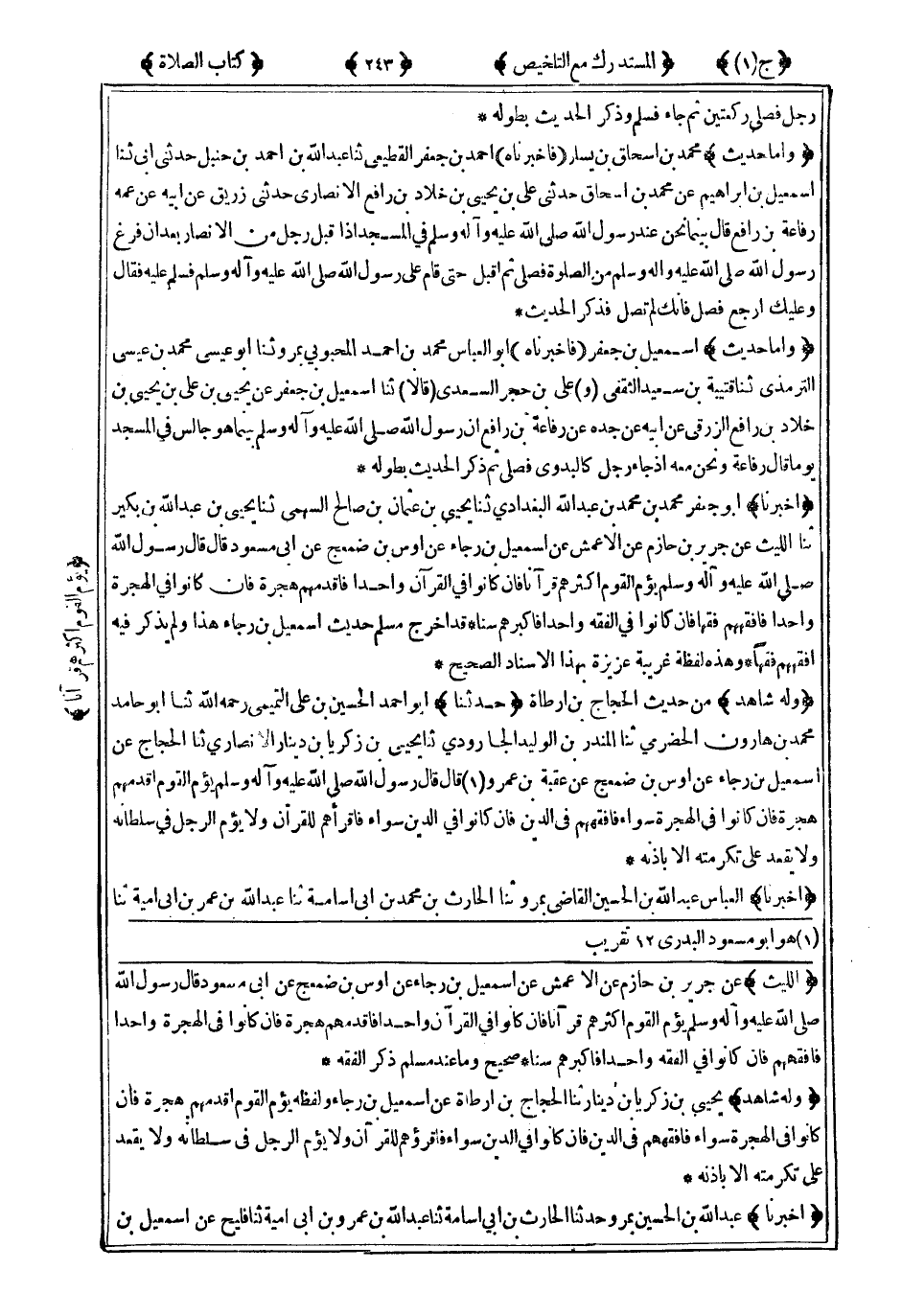 887- حَدَّثَنَا أَبُو أَحْمَدَ الْحُسَيْنُ بْنُ عَلِيٍّ التَّمِيمِيُّ ، رَحِمَهُ اللَّهُ ، حَدَّثَنَا أَبُو حَامِدٍ مُحَمَّدُ بْنُ هَارُونَ الْحَضْرَمِيُّ ، حَدَّثَنَا الْمُنْذِرُ بْنُ الْوَلِيدِ الْجَارُودِيُّ ، حَدَّثَنَا يَحْيَى بْنُ زَكَرِيَّا بْنِ دِينَارٍ الأَنْصَارِيُّ ، حَدَّثَنَا الْحَجَّاجُ ، عَنْ إِسْمَاعِيلَ بْنِ رَجَاءٍ ، عَنْ أَوْسِ بْنِ ضَمْعَجٍ ، عَنْ عُقْبَةَ بْنِ عَمْرٍو ، قَالَ : قَالَ رَسُولُ اللهِ صَلَّى اللَّهُ عَلَيْهِ وَسَلَّمَ : يَؤُمُّ الْقَوْمَ أَقْدَمُهُمْ هِجْرَةً ، فَإِنْ كَانُوا فِي الْهِجْرَةِ سَوَاءً فَأَفْقَهُهُمْ فِي الدِّينِ ، فَإِنْ كَانُوا فِي الدِّينِ سَوَاءً ، فَأَقْرَؤُهُمْ لِلْقُرْآنِ ، وَلاَ يُؤَمُّ الرَّجُلُ فِي سُلْطَانِهِ ، وَلاَ يُقْعَدُ عَلَى تَكْرِمَتِهِ إِلاَّ بِإِذْنِهِ.