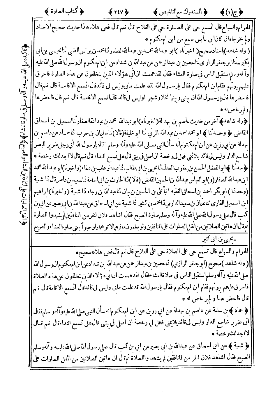 903- أَخْبَرْنَاهُ أَبُو عَبْدِ اللهِ مُحَمَّدُ بْنُ عَبْدِ اللهِ الصَّفَّارُ ، حَدَّثَنَا إِسْمَاعِيلُ بْنُ إِسْحَاقَ الْقَاضِي ، (ح) وَحَدَّثَنَا أَبُو مُحَمَّدٍ أَحْمَدُ بْنُ عَبْدِ اللهِ الْمُزَنِي ، حَدَّثَنَا أَبُو خَلِيفَةَ ، قَالاَ : حَدَّثَنَا سُلَيْمَانُ بْنُ حَرْبٍ ، حَدَّثَنَا حَمَّادٌ ، عَنْ عَاصِمِ بْنِ بَهْدَلَةَ ، عَنْ أَبِي رَزِينٍ ، عَنِ ابْنِ أُمِّ مَكْتُومٍ أَنَّهُ سَأَلَ النَّبِيَّ صَلَّى اللَّهُ عَلَيْهِ وَسَلَّمَ ، فَقَالَ : يَا رَسُولَ اللهِ إِنِّي رَجُلٌ ضَرِيرُ الْبَصَرِ ، شَاسِعُ الدَّارِ وَلَيْسَ لِي قَائِدٌ يُلاَئِمُنِي ، فَهَلْ لِي رُخْصَةٌ أَنْ أُصَلِّيَ فِي بَيْتِي ؟ قَالَ : هَلْ تَسْمَعُ النِّدَاءَ ؟ قَالَ : نَعَمْ ، قَالَ : لاَ أَجِدُ لَكَ رُخْصَةً.