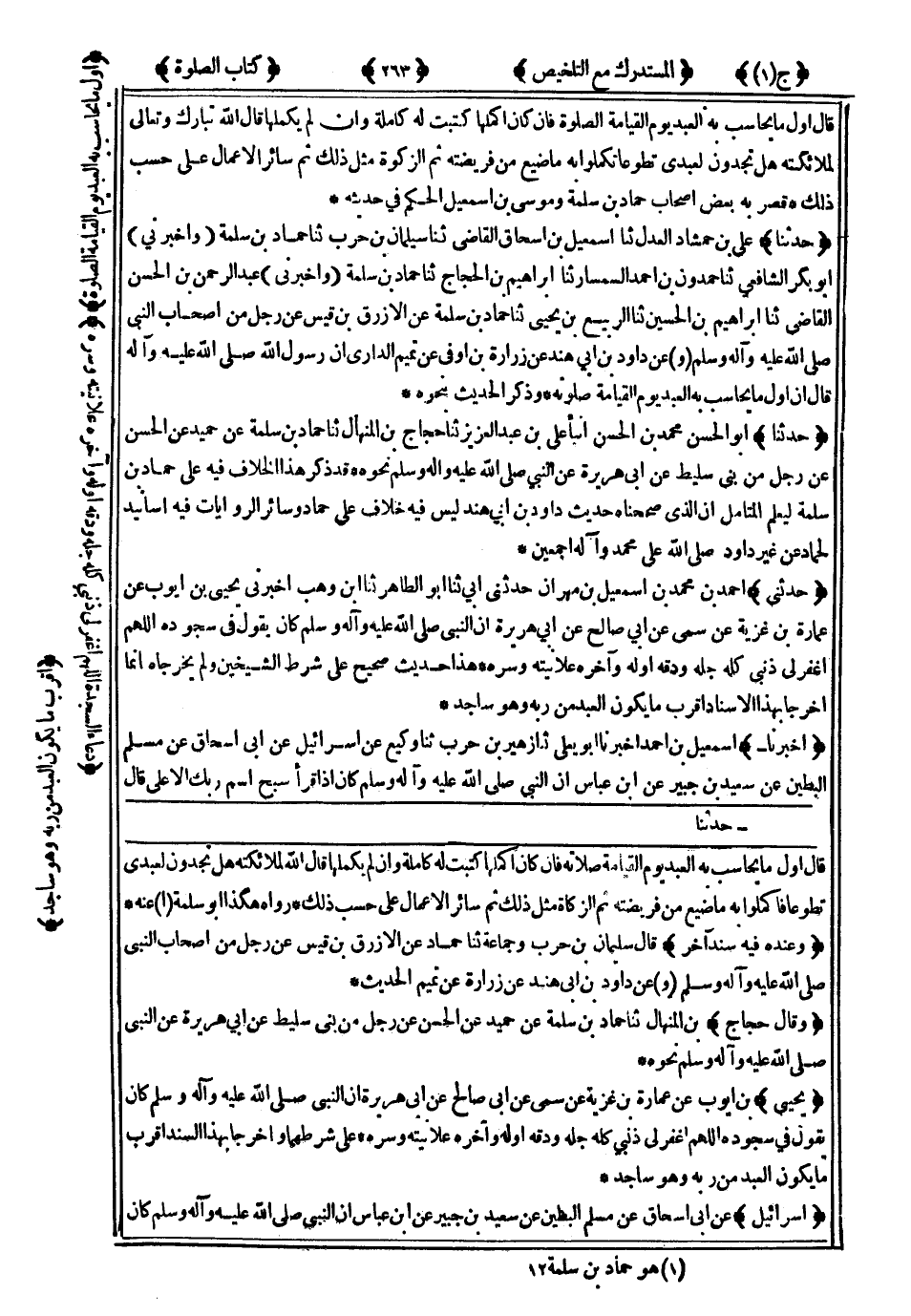 967- حَدَّثَنَا عَلِيُّ بْنُ حَمْشَاذَ الْعَدْلُ ، حَدَّثَنَا إِسْمَاعِيلُ بْنُ إِسْحَاقَ الْقَاضِي ، حَدَّثَنَا سُلَيْمَانُ بْنُ حَرْبٍ ، حَدَّثَنَا حَمَّادُ بْنُ سَلَمَةَ ، (ح) وَأَخْبَرَنِي أَبُو بَكْرٍ الشَّافِعِيُّ ، حَدَّثَنَا حَمْدُونُ بْنُ أَحْمَدَ السِّمْسَارُ ، حَدَّثَنَا إِبْرَاهِيمُ بْنُ الْحَجَّاجِ ، حَدَّثَنَا حَمَّادُ بْنُ سَلَمَةَ ، (ح) وَأَخْبَرَنِي عَبْدُ الرَّحْمَنِ بْنُ الْحَسَنِ الْقَاضِي ، حَدَّثَنَا إِبْرَاهِيمُ بْنُ الْحُسَيْنِ ، حَدَّثَنَا الرَّبِيعُ بْنُ يَحْيَى ، حَدَّثَنَا حَمَّادُ بْنُ سَلَمَةَ ، عَنِ الأَزْرَقِ بْنِ قَيْسٍ ، عَنْ رَجُلٍ مِنْ أَصْحَابِ النَّبِيِّ صَلَّى اللَّهُ عَلَيْهِ وَسَلَّمَ ، وَعَنْ دَاوُدَ بْنِ أَبِي هِنْدٍ ، عَنْ زُرَارَةَ بْنِ أَوْفَى ، عَنْ تَمِيمٍ الدَّارِيِّ أَنَّ رَسُولَ اللهِ صَلَّى اللَّهُ عَلَيْهِ وَسَلَّمَ ، قَالَ : أَوَّلُ مَا يُحَاسَبُ بِهِ الْعَبْدُ يَوْمَ الْقِيَامَةِ صَلاَتُهُ .