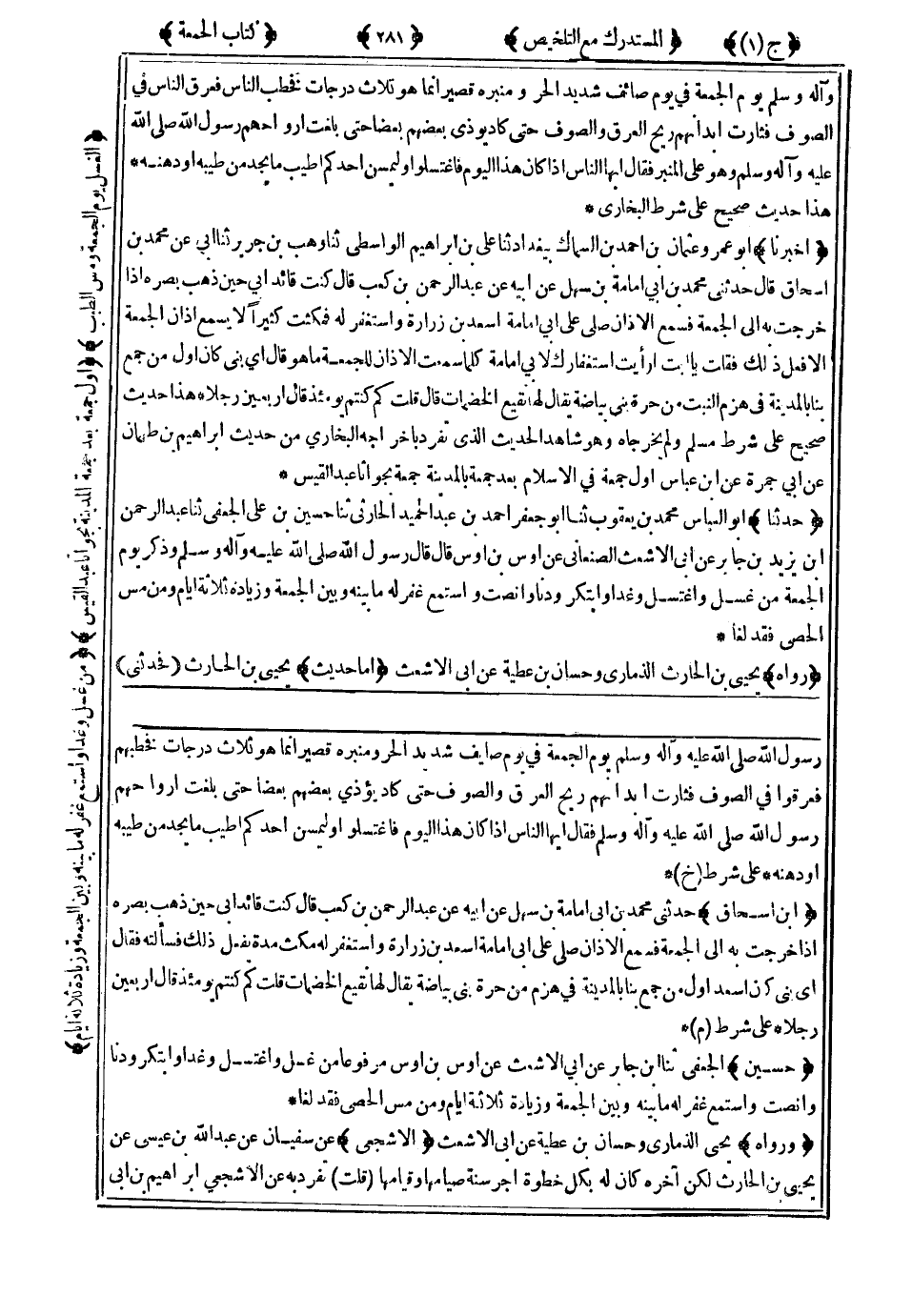 هَذَا حَدِيثٌ صَحِيحٌ عَلَى شَرْطِ مُسْلِمٍ وَلَمْ يُخَرِّجَاهُ ، وَهُوَ شَاهِدُ الْحَدِيثِ الَّذِي تَفَرَّدَ بِإِخْرَاجِهِ الْبُخَارِيُّ مِنْ حَدِيثِ إِبْرَاهِيمَ بْنِ طَهْمَانَ ، عَنْ أَبِي جَمْرَةَ ، عَنِ ابْنِ عَبَّاسٍ : أَوَّلُ جُمُعَةٍ فِي الإِسْلاَمِ بَعْدَ جُمُعَةٍ بِالْمَدِينَةِ جُمُعَةٌ بِجُوَاثَا عَبْدِ الْقَيْسِ.