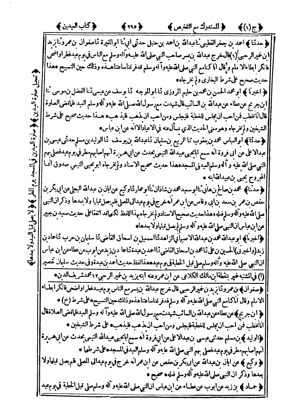 هَذَا حَدِيثٌ صَحِيحٌ عَلَى شَرْطِ الشَّيْخَيْنِ ، وَلَمْ يُخَرِّجَاهُ وَهُوَ مَعْنَى الْحَدِيثِ الَّذِي يُسْأَلُ عَنْهُ فِي الأَعْيَادِ إِلاَّ أَنَّهُ عَنِ ابْنِ عَبَّاسٍ.