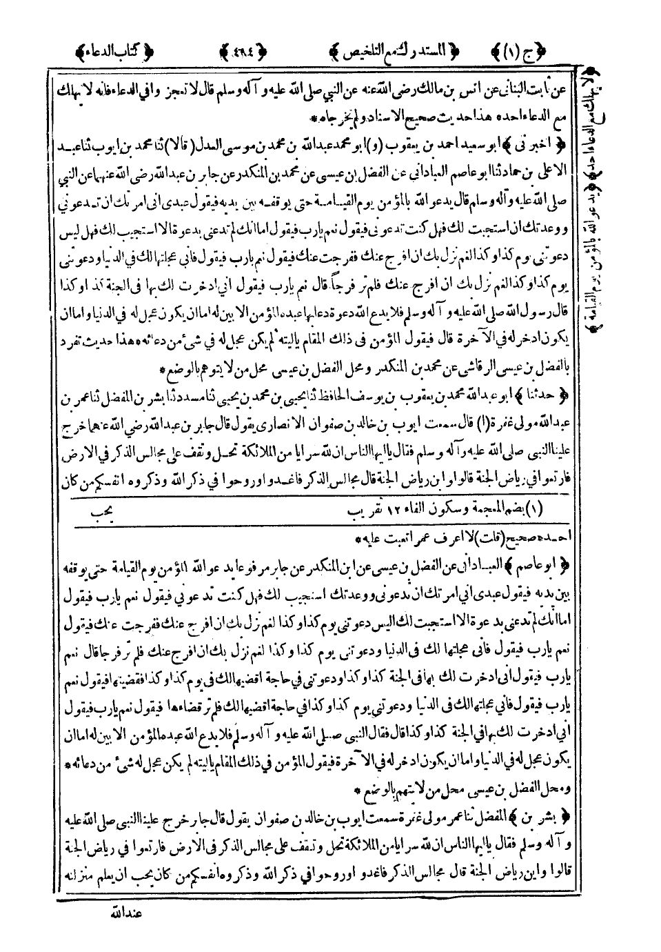 1820- حَدَّثَنَا أَبُو عَبْدِ اللهِ مُحَمَّدُ بْنُ يَعْقُوبَ بْنِ يُوسُفَ الْحَافِظُ ، حَدَّثَنَا يَحْيَى بْنُ مُحَمَّدِ بْنِ يَحْيَى ، حَدَّثَنَا مُسَدَّدٌ ، حَدَّثَنَا بِشْرُ بْنُ الْمُفَضَّلِ ، حَدَّثَنَا عُمَرُ بْنُ عَبْدِ اللهِ مَوْلَى غُفْرَةَ ، قَالَ : سَمِعْتُ أَيُّوبَ بْنَ خَالِدِ بْنِ صَفْوَانَ الأَنْصَارِيَّ ، يَقُولُ : قَالَ جَابِرُ بْنُ عَبْدِ اللهِ رَضِيَ اللَّهُ عَنْهُمَا خَرَجَ عَلَيْنَا النَّبِيُّ صَلَّى اللَّهُ عَلَيْهِ وَسَلَّمَ ، فَقَالَ : يَا أَيُّهَا النَّاسُ ، إِنَّ لِلَّهِ سَرَايَا مِنَ الْمَلاَئِكَةِ تَحِلُّ وَتَقِفُ عَلَى مَجَالِسِ الذِّكْرِ فِي الأَرْضِ ، فَارْتَعُوا فِي رِيَاضِ الْجَنَّةِ . قَالُوا : وَأَيْنَ رِيَاضُ الْجَنَّةِ ؟ قَالَ : مَجَالِسُ الذِّكْرِ ، فَاغْدُوا وَرُوحُوا فِي ذِكْرِ اللهِ ، وَذَكِّرُوهُ أَنْفُسَكُمْ مَنْ كَانَ يُحِبُّ أَنْ يَعْلَمَ مَنْزِلَتَهُ عِنْدَ اللهِ فَلْيَنْظُرْ كَيْفَ مَنْزِلَةُ اللهِ عِنْدَهُ ، فَإِنَّ اللَّهَ يُنْزِلُ الْعَبْدَ مِنْهُ حَيْثُ أَنْزَلَهُ مِنْ نَفْسِهِ .