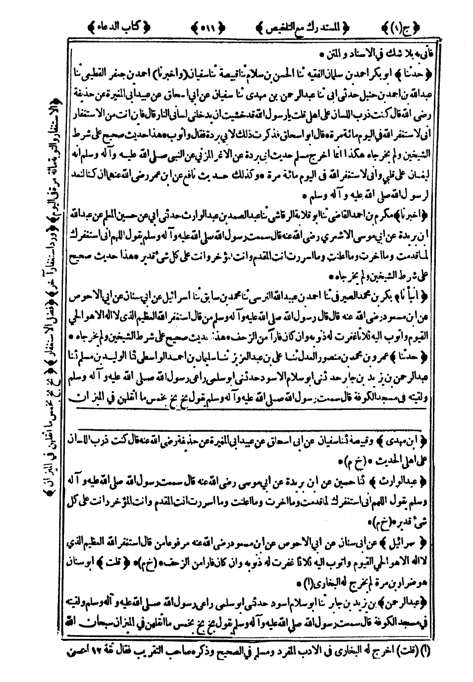 هَذَا حَدِيثٌ صَحِيحٌ عَلَى شَرْطِ الشَّيْخَيْنِ ، وَلَمْ يُخَرِّجَاهُ هَكَذَا إِنَّمَا أَخْرَجَ مُسْلِمٌ حَدِيثَ أَبِي بُرْدَةَ ، عَنِ الأَغَرِّ الْمُزَنِيِّ ، عَنِ النَّبِيِّ صَلَّى اللَّهُ عَلَيْهِ وَسَلَّمَ : إِنَّهُ لَيُغَانُ عَلَى قَلْبِي ، وَإِنِّي لاَسْتَغْفِرُ اللَّهَ فِي الْيَوْمِ مِائَةَ مَرَّةٍ وَكَذَلِكَ حَدِيثُ نَافِعٍ ، عَنِ ابْنِ عُمَرَ رَضِيَ اللَّهُ عَنْهُمَا : إِنْ كُنَّا لَنَعُدُّ لِرَسُولِ اللهِ صَلَّى اللَّهُ عَلَيْهِ وَسَلَّمَ.