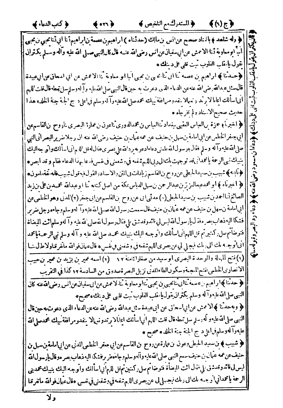 1929- أَخْبَرَنَا حَمْزَةُ بْنُ الْعَبَّاسِ الْعَقَبِيُّ بِبَغْدَادَ ، حَدَّثَنَا الْعَبَّاسُ بْنُ مُحَمَّدٍ الدُّورِيُّ ، حَدَّثَنَا عَوْنُ بْنُ عُمَارَةَ الْبَصْرِيُّ ، حَدَّثَنَا رَوْحُ بْنُ الْقَاسِمِ ، عَنْ أَبِي جَعْفَرٍ الْخَطْمِيِّ ، عَنْ أَبِي أُمَامَةَ بْنِ سَهْلِ بْنِ حُنَيْفٍ ، عَنْ عَمِّهِ عُثْمَانَ بْنِ حُنَيْفٍ رَضِيَ اللَّهُ عَنْهُ ، أَنَّ رَجُلاً ضَرِيرَ الْبَصَرِ أَتَى النَّبِيَّ صَلَّى اللَّهُ عَلَيْهِ وَسَلَّمَ ، فَقَالَ : يَا رَسُولَ اللهِ ، عَلِّمْنِي دُعَاءً أَدْعُو بِهِ يَرُدُّ اللَّهُ عَلَيَّ بَصَرِي ، فَقَالَ لَهُ : قُلِ اللَّهُمَّ إِنِّي أَسْأَلُكَ ، وَأَتَوَجَّهُ إِلَيْكَ بِنَبِيِّكَ نَبِيِّ الرَّحْمَةِ ، يَا مُحَمَّدُ إِنِّي قَدْ تَوَجَّهْتُ بِكَ إِلَى رَبِّي ، اللَّهُمَّ شَفِّعْهُ فِيَّ ، وَشَفِّعْنِي فِي نَفْسِي ، فَدَعَا بِهَذَا الدُّعَاءِ فَقَامَ وَقَدْ أَبْصَرَ .