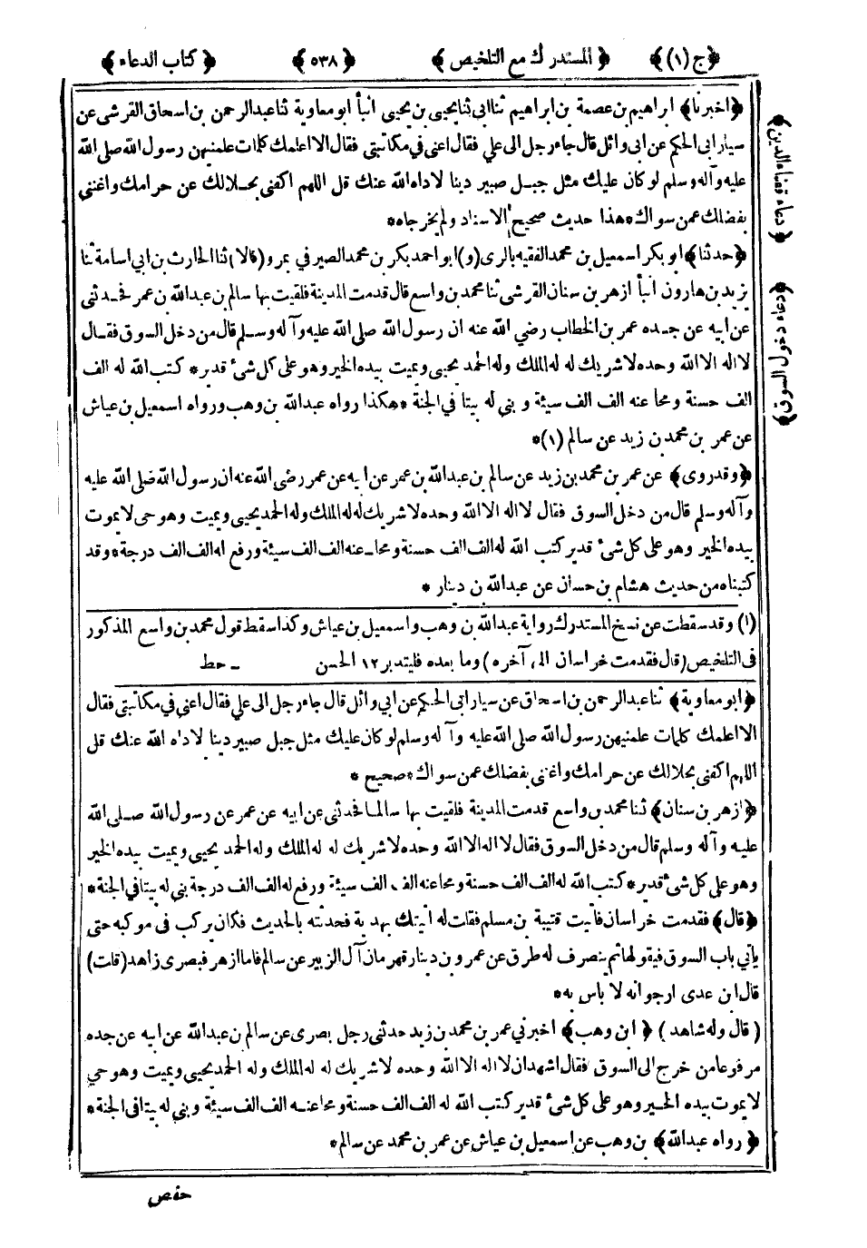 1974- حَدَّثَنَا أَبُو بَكْرٍ إِسْمَاعِيلُ بْنُ مُحَمَّدٍ الْفَقِيهُ بِالرِّيِّ ، وَأَبُو أَحْمَدَ بَكْرُ بْنُ مُحَمَّدٍ الصَّيْرَفِيُّ بِمَرْوَ ، قَالاَ : حَدَّثَنَا الْحَارِثُ بْنُ أَبِي أُسَامَةَ ، حَدَّثَنَا يَزِيدُ بْنُ هَارُونَ ، أَنْبَأَ أَزْهَرُ بْنُ سِنَانٍ الْقُرَشِيُّ ، حَدَّثَنَا مُحَمَّدُ بْنُ وَاسِعٍ ، قَالَ : قَدِمْتُ الْمَدِينَةَ فَلَقِيتُ بِهَا سَالِمَ بْنَ عَبْدِ اللهِ بْنِ عُمَرَ فَحَدَّثَنِي ، عَنْ أَبِيهِ ، عَنْ جَدِّهِ عُمَرَ بْنِ الْخَطَّابِ رَضِيَ اللَّهُ عَنْهُ ، عَنْ رَسُولِ اللهِ صَلَّى اللَّهُ عَلَيْهِ وَسَلَّمَ قَالَ : مَنْ دَخَلَ السُّوقَ ، فَقَالَ : لاَ إِلَهَ إِلاَّ اللَّهُ وَحْدَهُ لاَ شَرِيكَ لَهُ ، لَهُ الْمُلْكُ ، وَلَهُ الْحَمْدُ ، يُحْيِي وَيُمِيتُ ، بِيَدِهِ الْخَيْرُ ، وَهُوَ عَلَى كُلِّ شَيْءٍ قَدِيرٌ ، كَتَبَ اللَّهُ لَهُ أَلْفَ أَلْفَ حَسَنَةٍ ، وَمَحَا عَنْهُ أَلْفَ أَلْفَ سَيِّئَةٍ ، وَرَفَعَ لَهُ أَلْفَ أَلْفَ دَرَجَةٍ ، وَبَنَى لَهُ بَيْتًا فِي الْجَنَّةِ قَالَ : فَقَدِمْتُ خُرَاسَانَ فَأَتَيْتُ قُتَيْبَةَ بْنَ مُسْلِمٍ فَقُلْتُ لَهُ أَتَيْتُكَ بِهَدِيَّةٍ فَحَدَّثْتُهُ بِالْحَدِيثِ فَكَانَ قُتَيْبَةُ بْنُ مُسْلِمٍ يَرْكَبُ فِي مَوْكِبِهِ حَتَّى يَأْتِيَ بَابَ السُّوقِ فَيَقُولُهَا ، ثُمَّ يَنْصَرِفُ .