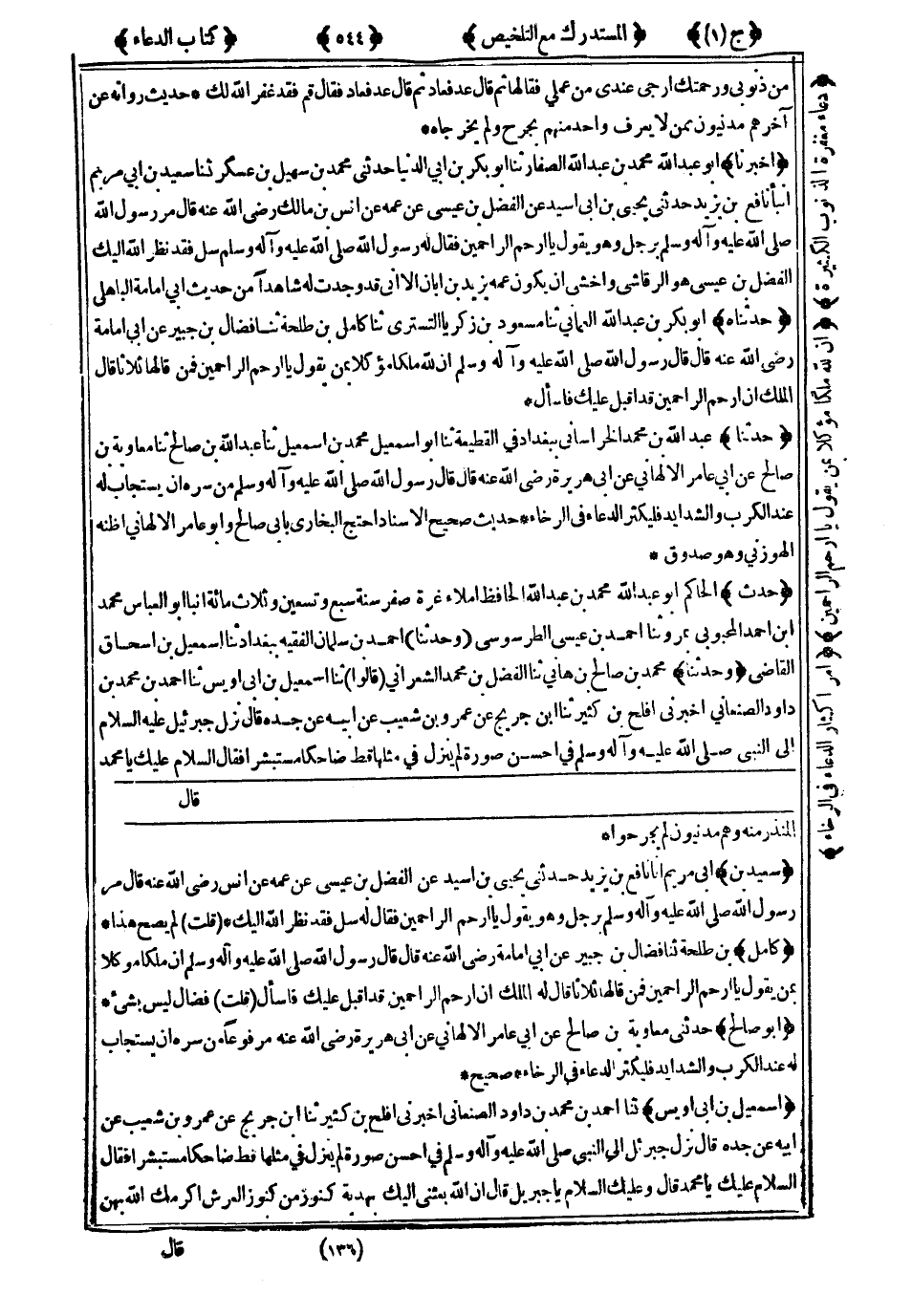1998- حَدَّثَ الْحَاكِمُ أَبُو عَبْدِ اللهِ مُحَمَّدُ بْنُ عَبْدِ اللهِ الْحَافِظُ إِمْلاَءً غُرَّةَ صَفَرٍ سَنَةَ سَبْعٍ وَتِسْعِينَ وَثَلاَثِ مِائَةٍ ، أَنْبَأَ أَبُو الْعَبَّاسِ مُحَمَّدُ بْنُ أَحْمَدَ الْمَحْبُوبِيُّ ، بِمَرْوَ ، حَدَّثَنَا أَحْمَدُ بْنُ عِيسَى الطَّرَسُوسِيُّ ، (ح) وَحَدَّثَنَا أَحْمَدُ بْنُ سَلْمَانَ الْفَقِيهُ ، بِبَغْدَادَ ، حَدَّثَنَا إِسْمَاعِيلُ بْنُ إِسْحَاقَ الْقَاضِي ، (ح) وَحَدَّثَنَا مُحَمَّدُ بْنُ صَالِحِ بْنِ هَانِئٍ ، حَدَّثَنَا الْفَضْلُ بْنُ مُحَمَّدٍ الشَّعْرَانِيُّ ، قَالُوا : حَدَّثَنَا إِسْمَاعِيلُ بْنُ أَبِي أُوَيْسٍ ، حَدَّثَنَا أَحْمَدُ بْنُ مُحَمَّدِ بْنِ دَاوُدَ الصَّنْعَانِيُّ ، أَخْبَرَنِي أَفْلَحُ بْنُ كَثِيرٍ ، حَدَّثَنَا ابْنُ جُرَيْجٍ ، عَنْ عَمْرِو بْنِ شُعَيْبٍ ، عَنْ أَبِيهِ ، عَنْ جَدِّهِ ، قَالَ : نَزَلَ جِبْرِيلُ عَلَيْهِ السَّلاَمُ إِلَى النَّبِيِّ صَلَّى اللَّهُ عَلَيْهِ وَسَلَّمَ فِي أَحْسَنِ صُورَةٍ لَمْ يَنْزِلٍ فِي مِثْلَهَا قَطُّ ضَاحِكًا مُسْتَبْشِرًا ، فَقَالَ : السَّلاَمُ عَلَيْكَ يَا مُحَمَّدُ ، قَالَ : وَعَلَيْكَ السَّلاَمُ يَا جِبْرِيلُ ، قَالَ : إِنَّ اللَّهَ بَعَثَنِي إِلَيْكَ بِهَدِيَّةِ كُنُوزِ الْعَرْشِ أَكْرَمَكَ اللَّهُ بِهِنَّ ، قَالَ : وَمَا تِلْكَ الْهَدِيَّةُ يَا جِبْرِيلُ ، فَقَالَ جِبْرِيلُ قُلْ يَا مَنْ أَظْهَرَ الْجَمِيلَ وَسَتَرَ الْقَبِيحَ ، يَا مَنْ لاَ يُؤَاخِذُ بِالْجَرِيرَةِ ، وَلاَ يَهْتِكُ السِّتْرَ يَا عَظِيمَ الْعَفْوِ ، يَا حَسَنَ التَّجَاوُزِ ، يَا وَاسِعَ الْمَغْفِرَةِ ، يَا بَاسِطَ الْيَدَيْنِ بِالرَّحْمَةِ ، يَا صَاحِبَ كُلِّ نَجْوَى ، وَيَا مُنْتَهَى كُلِّ شَكْوَى ، يَا كَرِيمَ الصَّفْحِ ، يَا عَظِيمَ الْمَنِّ ، يَا مُبْتَدِئَ النِّعَمِ قَبْلَ اسْتَحْقَاقِهَا ، يَا رَبَّنَا ، وَيَا سَيِّدَنَا ، وَيَا مَوْلاَنَا ، وَيَا غَايَةَ رَغْبَتُنَا ، أَسْأَلُكَ يَا اللَّهَ أَنْ لاَ تَشْوِي خَلْقِي بِالنَّارِ ، فَقَالَ رَسُولُ اللهِ صَلَّى اللَّهُ عَلَيْهِ وَسَلَّمَ : فَمَا ثَوَابُ هَذِهِ الْكَلِمَاتِ - ثُمَّ ذَكَرَ بَاقِي الْحَدِيثِ بَعْدَ الدُّعَاءِ بِطُولِهِ .