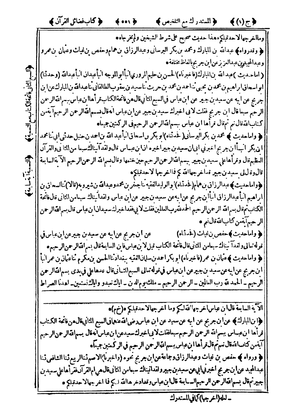 2025- فَأَخْبَرَنَاهُ أَبُو بَكْرٍ أَحْمَدُ بْنُ سَلْمَانَ الْفَقِيهُ ، بِبَغْدَادَ ، حَدَّثَنَا الْحَسَنُ بْنُ مُكْرَمٍ ، حَدَّثَنَا عُثْمَانُ بْنُ عُمَرَ ، أَنْبَأَ ابْنُ جُرَيْجٍ ، عَنْ أَبِيهِ ، عَنْ سَعِيدِ بْنِ جُبَيْرٍ ، عَنِ ابْنِ عَبَّاسٍ فِي قَوْلِهِ تَعَالَى السَّبْعَ الْمَثَانِي ، قَالَ : عَدَّهَا عَلَيَّ فِي يَدِي {بِسْمِ اللهِ الرَّحْمَنِ الرَّحِيمِ ، الْحَمْدُ لِلَّهِ رَبِّ الْعَالَمِينَ ، الرَّحْمَنِ الرَّحِيمِ ، مَالِكِ يَوْمِ الدِّينِ ، إِيَّاكَ نَعْبُدُ وَإِيَّاكَ نَسْتَعِينُ ، اهْدِنَا الصِّرَاطَ الْمُسْتَقِيمَ ، صِرَاطَ الَّذِينَ أَنْعَمْتَ عَلَيْهِمْ غَيْرِ الْمَغْضُوبِ عَلَيْهِمْ وَلاَ الضَّالِّينَ} ثُمَّ قَالَ : أَخْرَجَهَا اللَّهُ لَكُمْ فَمَا أَخْرَجَهَا لَغَيْرِكُمْ.