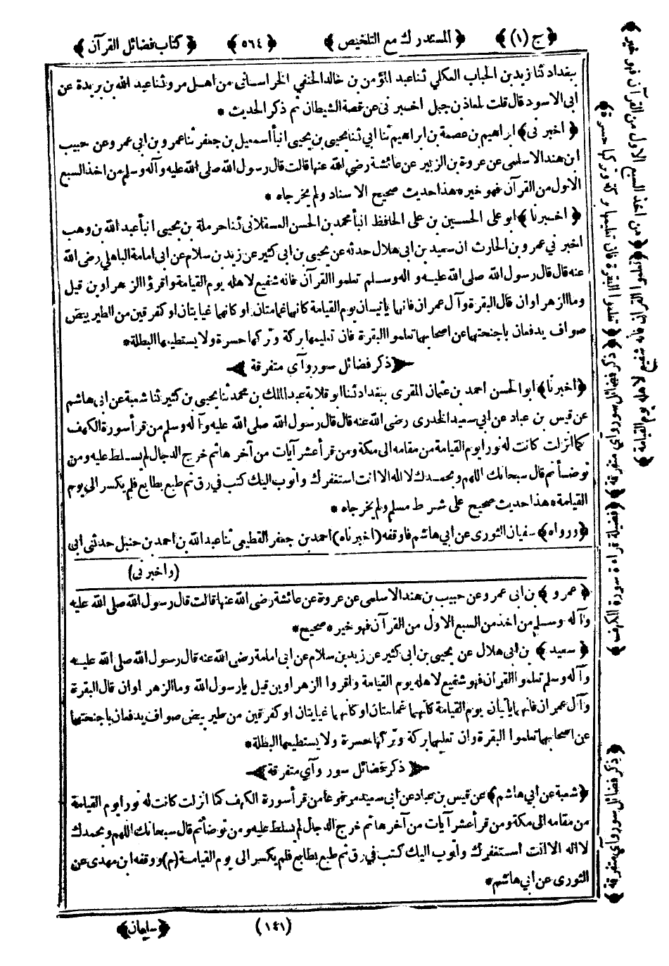 2071- أَخْبَرَنَا أَبُو عَلِيٍّ الْحُسَيْنُ بْنُ عَلِيٍّ الْحَافِظُ ، أَنْبَأَ مُحَمَّدُ بْنُ الْحَسَنِ الْعَسْقَلاَنِيُّ ، حَدَّثَنَا حَرْمَلَةُ بْنُ يَحْيَى ، أَنْبَأَ عَبْدُ اللهِ بْنُ وَهْبٍ ، أَخْبَرَنِي عَمْرُو بْنُ الْحَارِثِ ، أَنَّ سَعِيدَ بْنَ أَبِي هِلاَلٍ ، حَدَّثَهُ ، عَنْ يَحْيَى بْنِ أَبِي كَثِيرٍ ، عَنْ زَيْدِ بْنِ سَلاَمٍ ، عَنْ أَبِي أُمَامَةَ الْبَاهِلِيِّ رَضِيَ اللَّهُ عَنْهُ ، قَالَ : قَالَ رَسُولُ اللهِ صَلَّى اللَّهُ عَلَيْهِ وَسَلَّمَ : تَعَلَّمُوا الْقُرْآنَ فَإِنَّهُ شَفِيعٌ لاِهْلِهِ يَوْمَ الْقِيَامَةِ ، وَاقْرَؤُوا الزَّهْرَاوَيْنِ قِيلَ : وَمَا الزَّهْرَاوَانِ ؟ قَالَ : الْبَقَرَةُ ، وَآلُ عِمْرَانَ ، فَإِنَّهُمَا يَأْتِيَانِ يَوْمَ الْقِيَامَةِ كَأَنَّهُمَا غَمَامَتَانِ ، أَوْ كَأَنَّهُمَا غَيَايَتَانِ ، أَوْ كَفِرْقَيْنِ مِنَ الطَّيْرِ بِيضٍ صَوَافَّ يَدْفَعَانِ بَأَجْنِحَتِهِمَا عَنْ أَصْحَابِهِمَا ، تَعَلَّمُوا الْبَقَرَةَ فَإِنَّ تَعَلُّمَهَا بَرَكَةٌ ، وَتَرْكَهَا حَسْرَةٌ ، وَلاَ يَسْتَطِيعُهَا الْبَطَلَةُ.