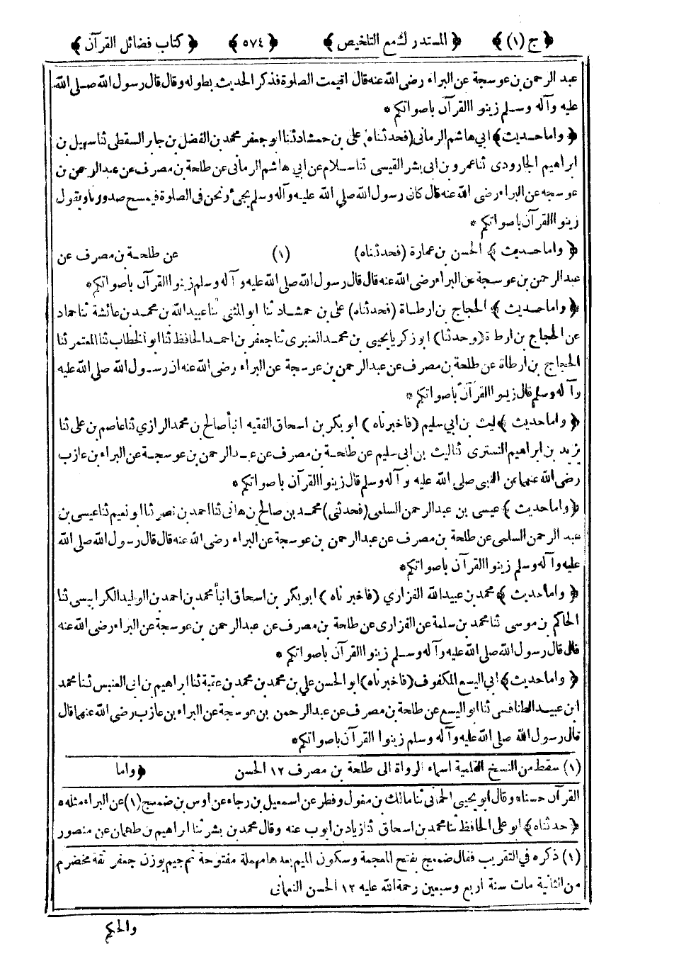 2119- فَحَدَّثَنَاهُ عَلِيُّ بْنُ حَمْشَاذٍ ، حَدَّثَنَا أَبُو الْمُثَنَّى ، حَدَّثَنَا عُبَيْدُ اللهِ بْنُ مُحَمَّدِ بْنِ عَائِشَةَ ، حَدَّثَنَا حَمَّادٌ ، عَنِ الْحَجَّاجِ بْنِ أَرْطَأَةَ ، (ح) وَحَدَّثَنَا أَبُو زَكَرِيَّا يَحْيَى بْنُ مُحَمَّدٍ الْعَنْبَرِيُّ ، حَدَّثَنَا جَعْفَرُ بْنُ أَحْمَدَ الْحَافِظُ ، حَدَّثَنَا أَبُو الْخَطَّابِ ، حَدَّثَنَا الْمُعْتَمِرُ ، حَدَّثَنَا الْحَجَّاجُ بْنُ أَرْطَأَةَ ، عَنْ طَلْحَةَ بْنِ مُصَرِّفٍ ، عَنْ عَبْدِ الرَّحْمَنِ بْنِ عَوْسَجَةَ ، عَنِ الْبَرَاءِ رَضِيَ اللَّهُ عَنْهُ ، أَنَّ رَسُولَ اللهِ صَلَّى اللَّهُ عَلَيْهِ وَسَلَّمَ ، قَالَ : زَيِّنُوا الْقُرْآنَ بِأَصْوَاتِكُمْ.