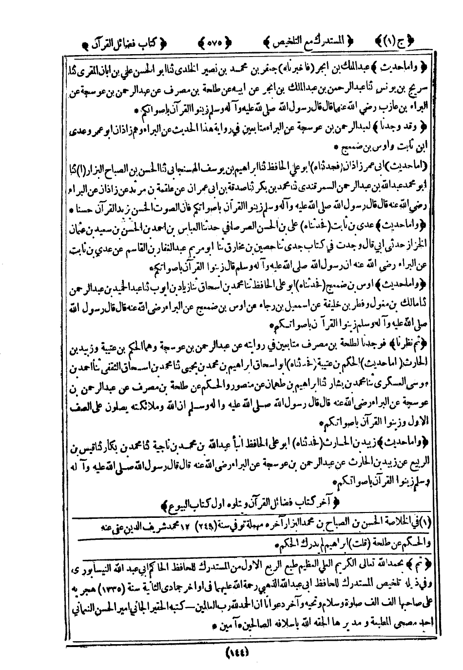 2125- فَحَدَّثَنَاهُ أَبُو عَلِيٍّ الْحَافِظُ ، حَدَّثَنَا إِبْرَاهِيمُ بْنُ يُوسُفَ الْهِسِنْجَانِيُّ ، حَدَّثَنَا الْحَسَنُ بْنُ الصَّبَّاحِ الْبَزَّارُ ، حَدَّثَنَا أَبُو مُحَمَّدٍ عَبْدُ اللهِ بْنُ عَبْدِ الرَّحْمَنِ السَّمَرْقَنْدِيُّ ، حَدَّثَنَا مُحَمَّدُ بْنُ بَكْرٍ ، حَدَّثَنَا صَدَقَةُ بْنُ أَبِي عِمْرَانَ ، عَنْ عَلْقَمَةَ بْنِ مَرْثَدٍ ، عَنْ زَاذَانَ ، عَنِ الْبَرَاءِ رَضِيَ اللَّهُ عَنْهُ ، قَالَ : قَالَ رَسُولُ اللهِ صَلَّى اللَّهُ عَلَيْهِ وَسَلَّمَ : زَيِّنُوا الْقُرْآنَ بِأَصْوَاتِكُمْ ، فَإِنَّ الصَّوْتَ الْحَسَنَ يَزِيدُ الْقُرْآنَ حُسْنًا.
