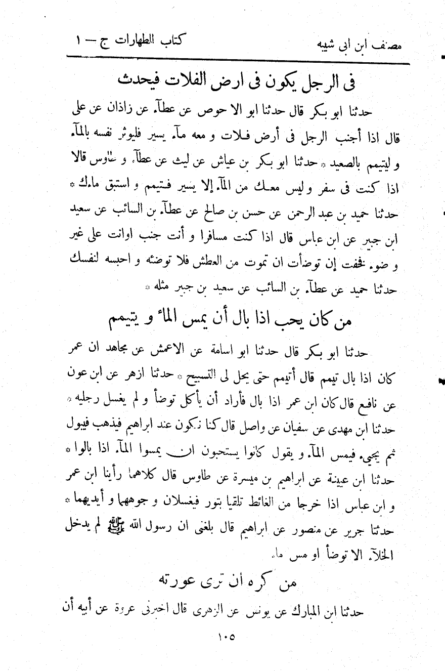 1128- حَدَّثَنَا أَبُو أُسَامَةَ ، عَنِ الأَعْمَشِ ، عَنْ مُجَاهِدٍ ؛ أَنَّ عُمَرَ كَانَ إذَا بَالَ تَيَمَّمَ ، قَالَ : أَتَيَمَّمُ حَتَّى يَحِلَّ لِي التَّسْبِيحُ.