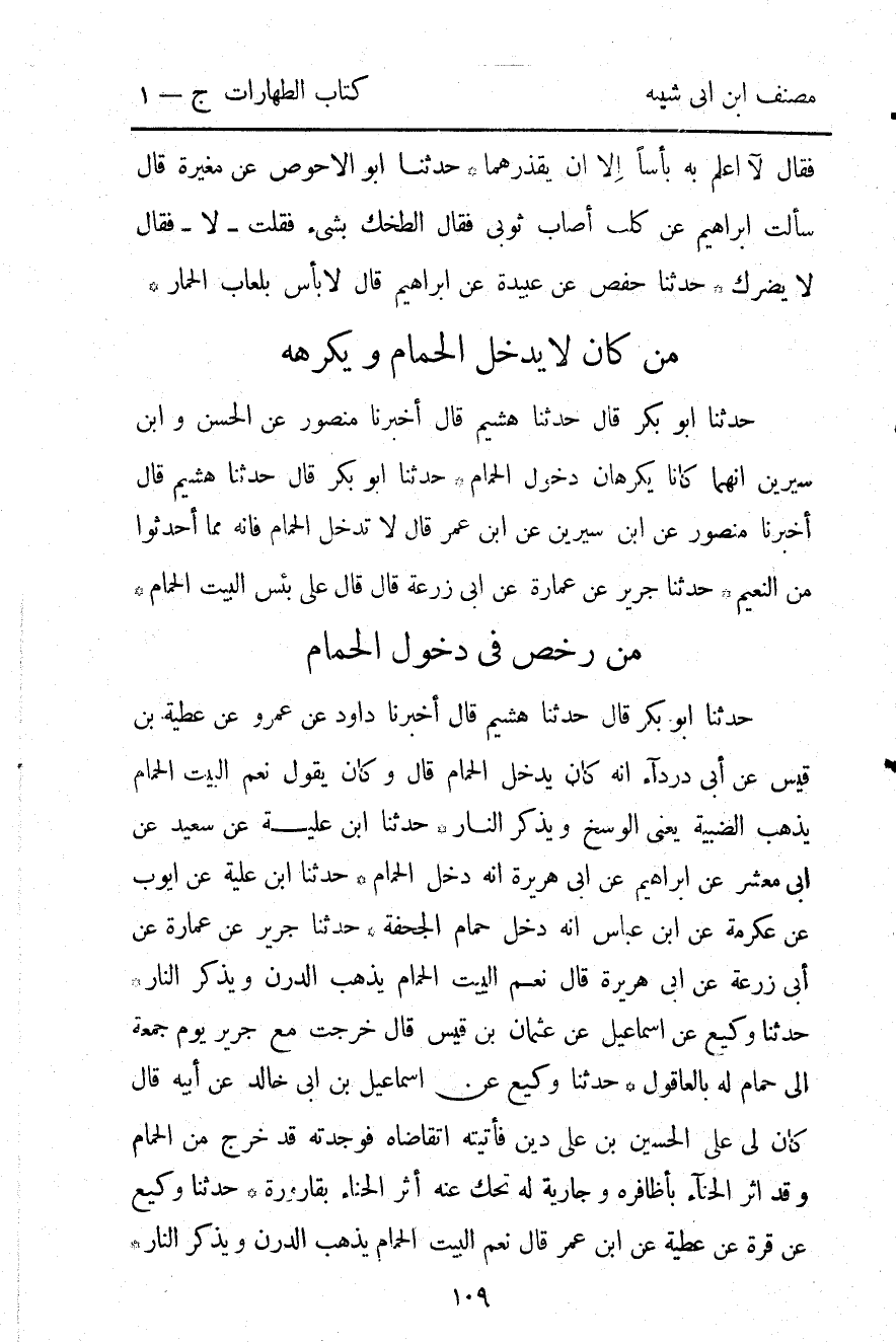 1170- حَدَّثَنَا هُشَيْمٌ ، قَالَ : أَخْبَرَنَا مَنْصُورٌ ، عَنِ الْحَسَنِ ، وَابْنِ سِيرِينَ : أَنَّهُمَا كَانَا يَكْرَهَانِ دُخُولَ الْحَمَّامِ.