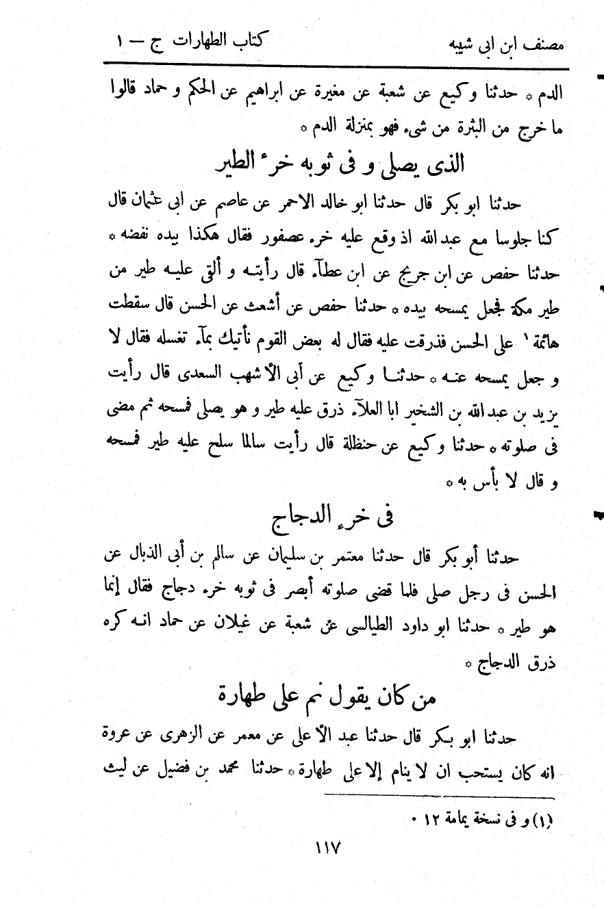 1261- حَدَّثَنَا أَبُو خَالِدٍ الأَحْمَرِِِ ، عَنْ عَاصِمٍ ، عَنْ أَبِي عُثْمَانَ ، قَالَ : كُنَّا جُلُوسًا مَعَ عَبْدِ اللهِ إذْ وَقَعَ عَلَيْهِ خُرْءُ عُصْفُورٍ ، فَقَالَ لَهُ : هَكَذَا بِيَدِهِ ، نَفَضَهُ.