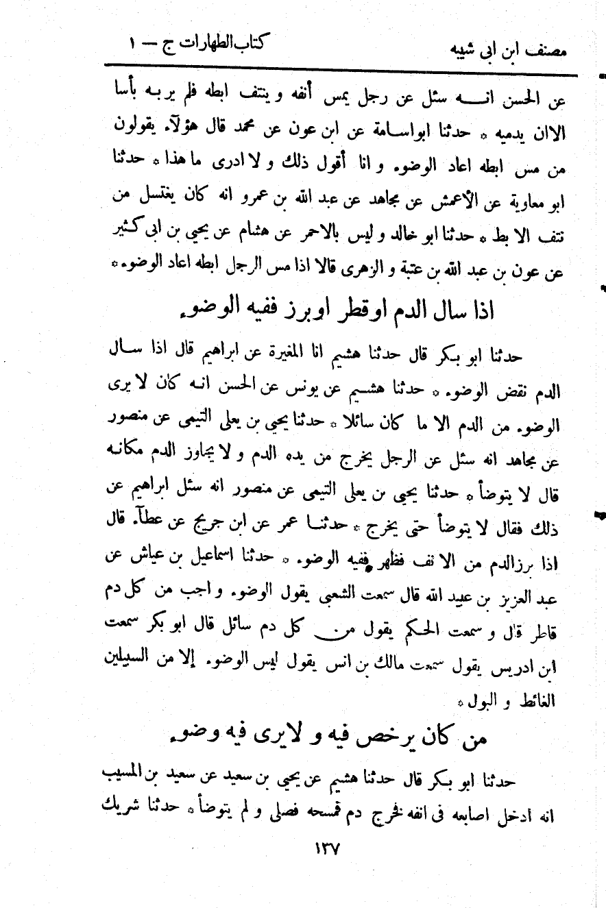 1468- حَدَّثَنَا هُشَيْمٌ ، عَنْ يُونُسَ ، عَنِ الْحَسَنِ ؛ أَنَّهُ كَانَ لاَ يَرَى الْوُضُوءَ مِنَ الدَّمِ إِلاَّ مَا كَانَ سَائِلاً.
