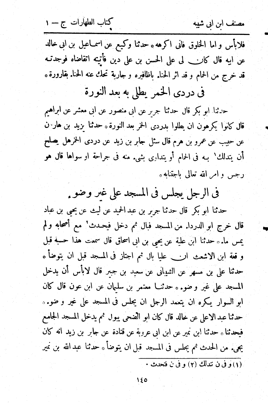 1554- حَدَّثَنَا ابْنُ نُمَيْرٍ ، عَنِ ابْنِ أَبِي عَرُوبَةَ ، عَنْ قَتَادَةَ ، عَنْ جَابِرِ بْنِ زَيْدٍ ؛ أَنَّهُ كَانَ يَجِيءُ مِنَ الْحَدَثِ ، ثُمَّ يَجْلِسُ فِي الْمَسْجِدِ قَبْلَ أَنْ يَتَوَضَّأَ.