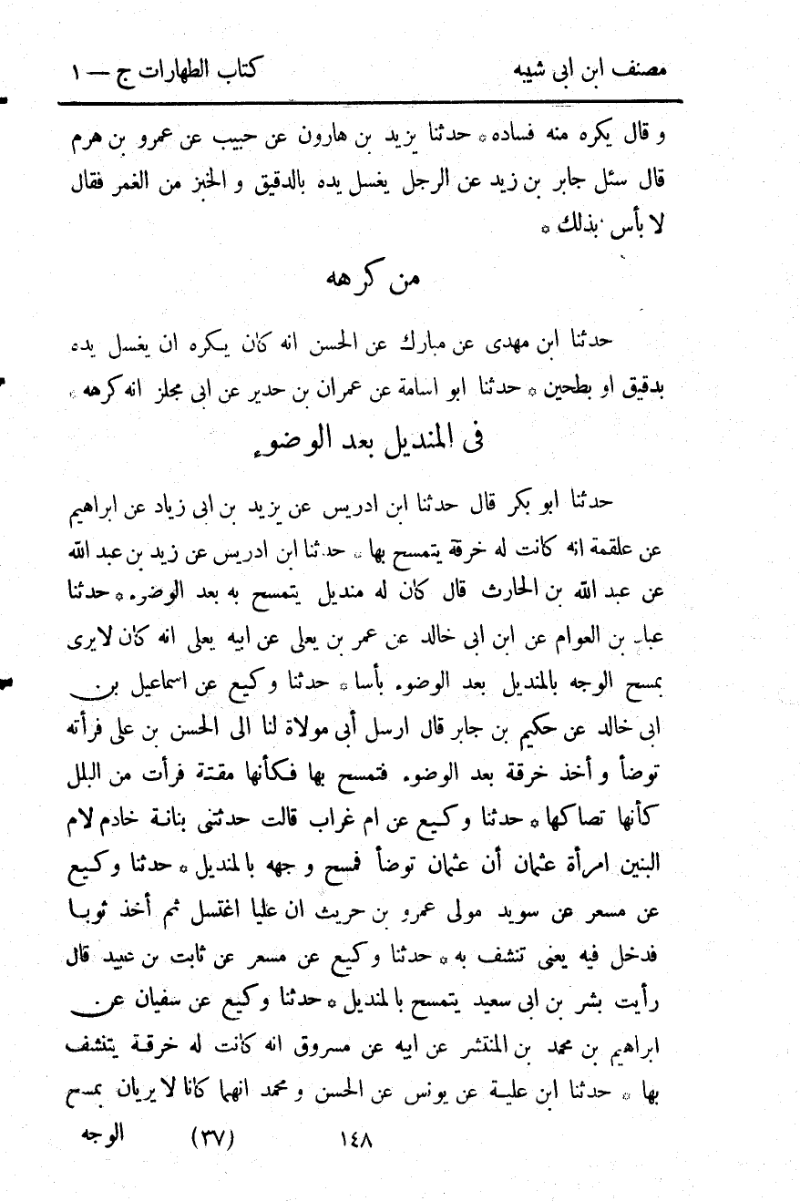 1582- حَدَّثَنَا ابْنُ إدْرِيسَ ، عَنْ يَزَيْدِ بْنِ عَبْدِ اللهِ ، عَنْ عَبْدِ اللهِ بْنِ الْحَارِثِ ، قَالَ : كَانَ لَهُ مِنْدِيلٌ يَتَمَسَّحُ بِهِ بَعْدَ الْوُضُوءِ.
