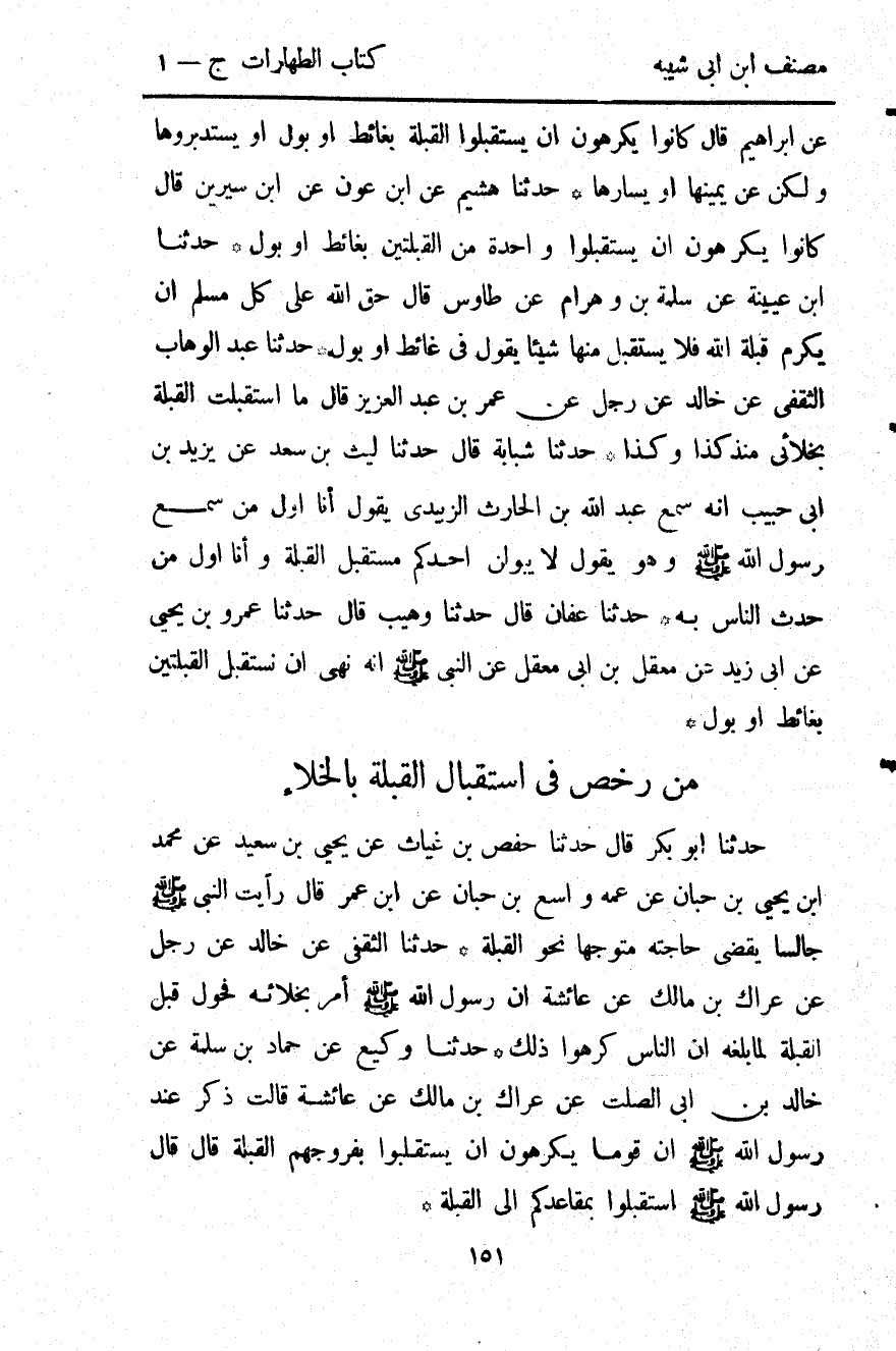 1616- حَدَّثَنَا هُشَيْمٌ ، عَنِ ابْنِ عَوْنٍ ، عَنِ ابْنِ سِيرِينَ ، قَالَ : كَانُوا يَكْرَهُونَ أَنْ يَسْتَقْبِلُوا وَاحِدَةً مِنَ الْقِبْلَتَيْنِ بِغَائِطٍ ، أَوْ بَوْلٍ.
