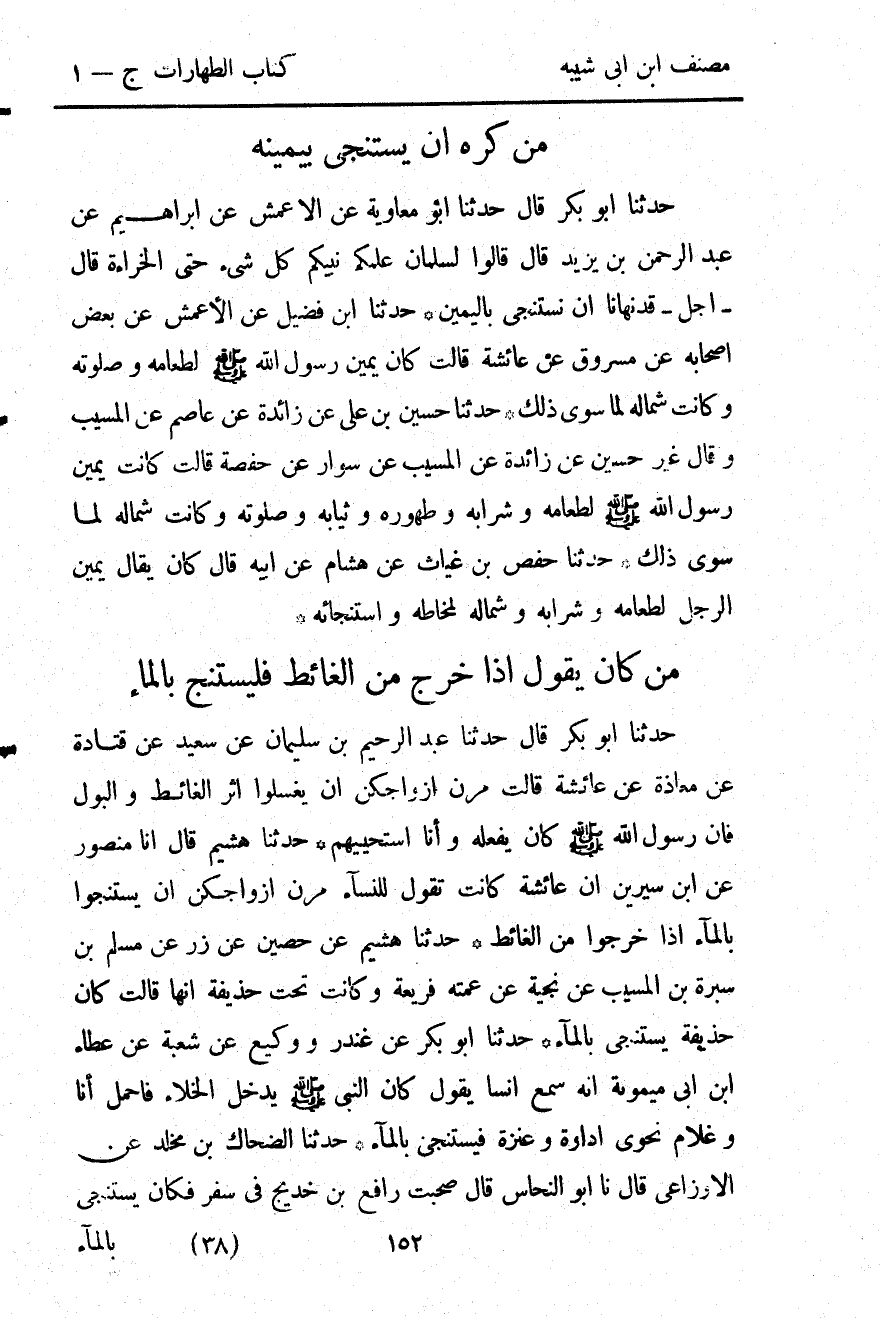 1631- حَدَّثَنَا هُشَيْمٌ ، عَنْ حُصَيْنٍ ، عَنْ ذَرٍّ ، عَنْ مُسْلِمِ بْنِ سَبْرَةَ بْنِ الْمُسَيَّبِ بْنِ نَجَبةَ ، عَنْ عَمَّتِهِ فُرَيْعَةَ ، وَكَانَتْ تَحْتَ حُذَيْفَةَ ، أَنَّهَا قَالَتْ : كَانَ حُذَيْفَةُ يَسْتَنْجِي بِالْمَاءِ.