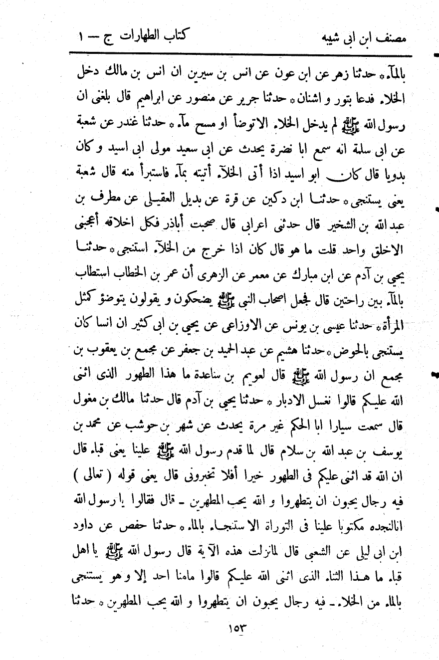 1641- حَدَّثَنَا يَحْيَى بْنُ آدَمَ ، قَالَ : حدَّثَنَا مَالِكُ بْنُ مِغْوَلٍ ، قَالَ : سَمِعْتُ سَيَّارًا أَبَا الْحَكَمِ ، غَيْرَ مَرَّةٍ ، يُحَدِّثُ عَنْ شَهْرِ بْنِ حَوْشَبٍ ، عَنْ مُحَمَّدِ بْنِ عَبْدِ اللهِ بْنِ سَلاَمٍ ، قَالَ : لَمَّا قَدِمَ رَسُولُ اللهِ صلى الله عليه وسلم عَلَيْنَا ، يَعْنِي : قُبَاءَ ، قَالَ : إنَّ اللَّهَ قَدْ أَثْنَى عَلَيْكُمْ فِي الطُّهُورِ خَيْرًا ، أَفَلاَ تُخْبِرُونِني ؟ قَالَ : يَعْنِي قوله تعالى : {فِيهِ رِجَالٌ يُحِبُّونَ أَنْ يَتَطَهَّرُوا وَاللَّهُ يُحِبُّ الْمُطَّهِّرِينَ} قَالَ : فَقَالُوا : يَا رَسُولَ اللهِ ، إنَّا لَنَجِدُهُ مَكْتُوبًا عَلَيْنَا فِي التَّوْرَاةِ : الاسْتِنْجَاءُ بِالْمَاءِ.