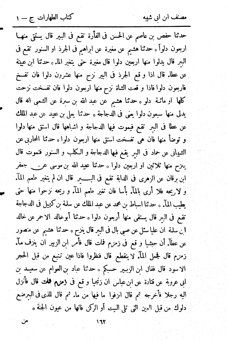 1729- حَدَّثَنَا الْمُحَارِبِيُّ ، عَنِ الشَّيْبَانِيِّ ، عَنْ حَمَّادٍ ؛ فِي الْبِئْرِ يَقَعُ فِيهَا الدَّجَاجَةُ وَالْكَلْبُ وَالسِّنَّوْرُ فَيَمُوتُ ، قَالَ : يَنْزِحُ مِنْهَا ثَلاَثِينَ ، أَوْ أَرْبَعِينَ دَلْوًا.