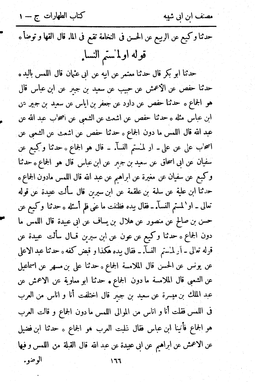 1776- حَدَّثَنَا وَكِيعٌ ، عَنْ عَوْنٍ ، عَنِ ابْنِ سِيرِينَ ، قَالَ : سَأَلْتُ عَبِيْدَةَ عَنْ قوله تعالى : {أَوْ لاَمَسْتُمَ النِّسَاءَ} فَقَالَ : بِيَدِهِ هَكَذَا ، وَقَبَضَ كَفَّهُ.