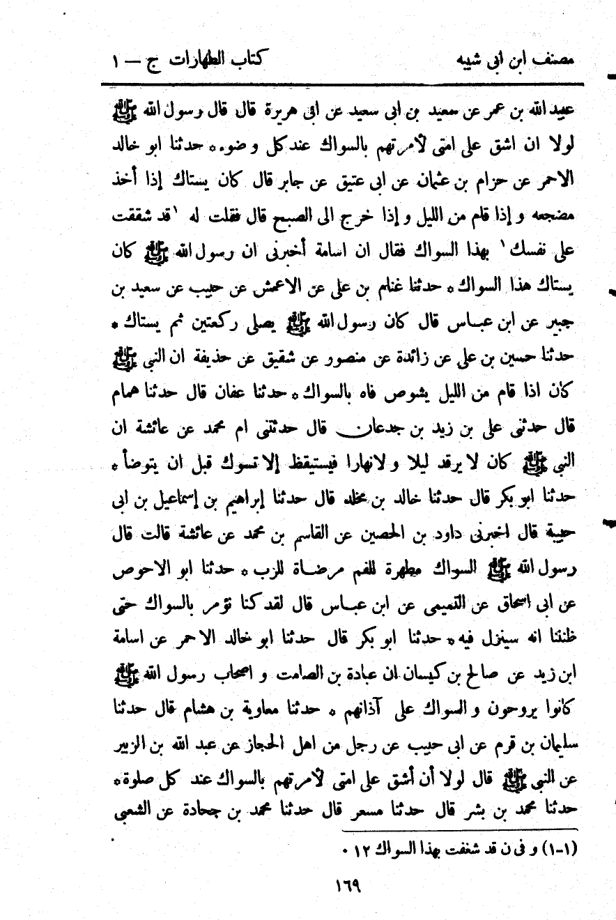 1799- حَدَّثَنَا أَبُو خَالِدٍ الأَحْمَرِِِ ، عَنْ حَرَامِ بْنِ عُثْمَانَ ، عَنْ أَبِي عَتِيقٍ ، عَنْ جَابِرٍ ، قَالَ : كَانَ يَسْتَاكُ إذَا أَخَذَ مَضْجَعَهُ ، وَإِذَا قَامَ مِنَ اللَّيْلِ ، وَإِذَا خَرَجَ إلَى الصُّبْحِ ، قَالَ : فَقُلْتُ لَهُ : قَدْ شَقَقْتَ عَلَى نَفْسِكَ بِهَذَا السِّوَاكِ ؟ فَقَالَ : إنَّ أُسَامَةَ أَخْبَرَنِي أَنَّ رَسُولَ اللهِ صلى الله عليه وسلم كَانَ يَسْتَاكُ هَذَا السِّوَاكَ.
