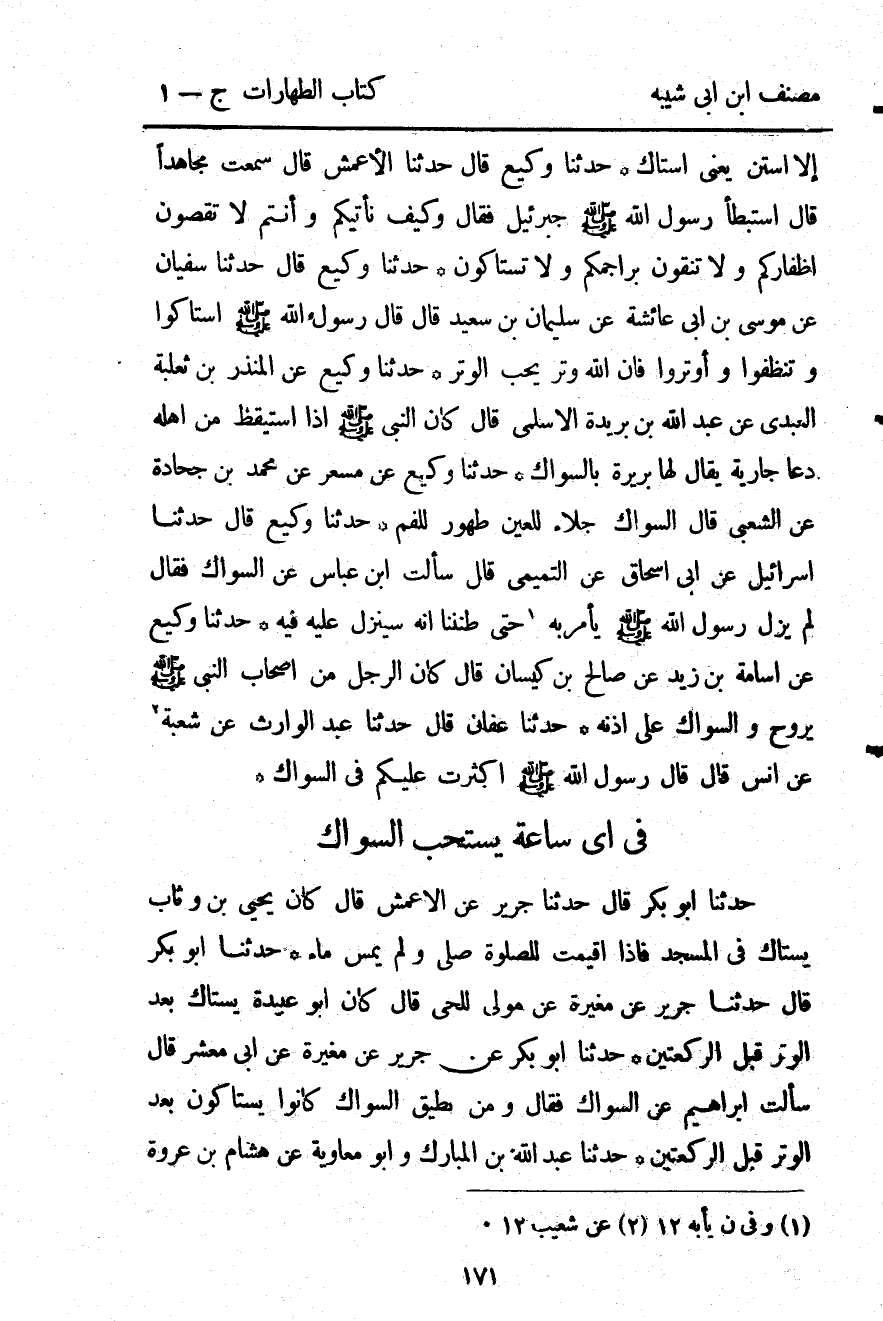 1824- حَدَّثَنَا جَرِيرٍ ، عَنْ مُغِيرَةَ ، عَنْ أَبِي مَعْشَرٍ ، قَالَ : سَأَلْتُ إبْرَاهِيمَ عَنِ السِّوَاكِ ؟ فَقَالَ : وَمَنْ يُطِيقُ السِّوَاكَ ؟ كَانُوا يَسْتَاكُونَ بَعْدَ الْوِتْرِ قَبْلَ الرَّكْعَتَيْنِ.