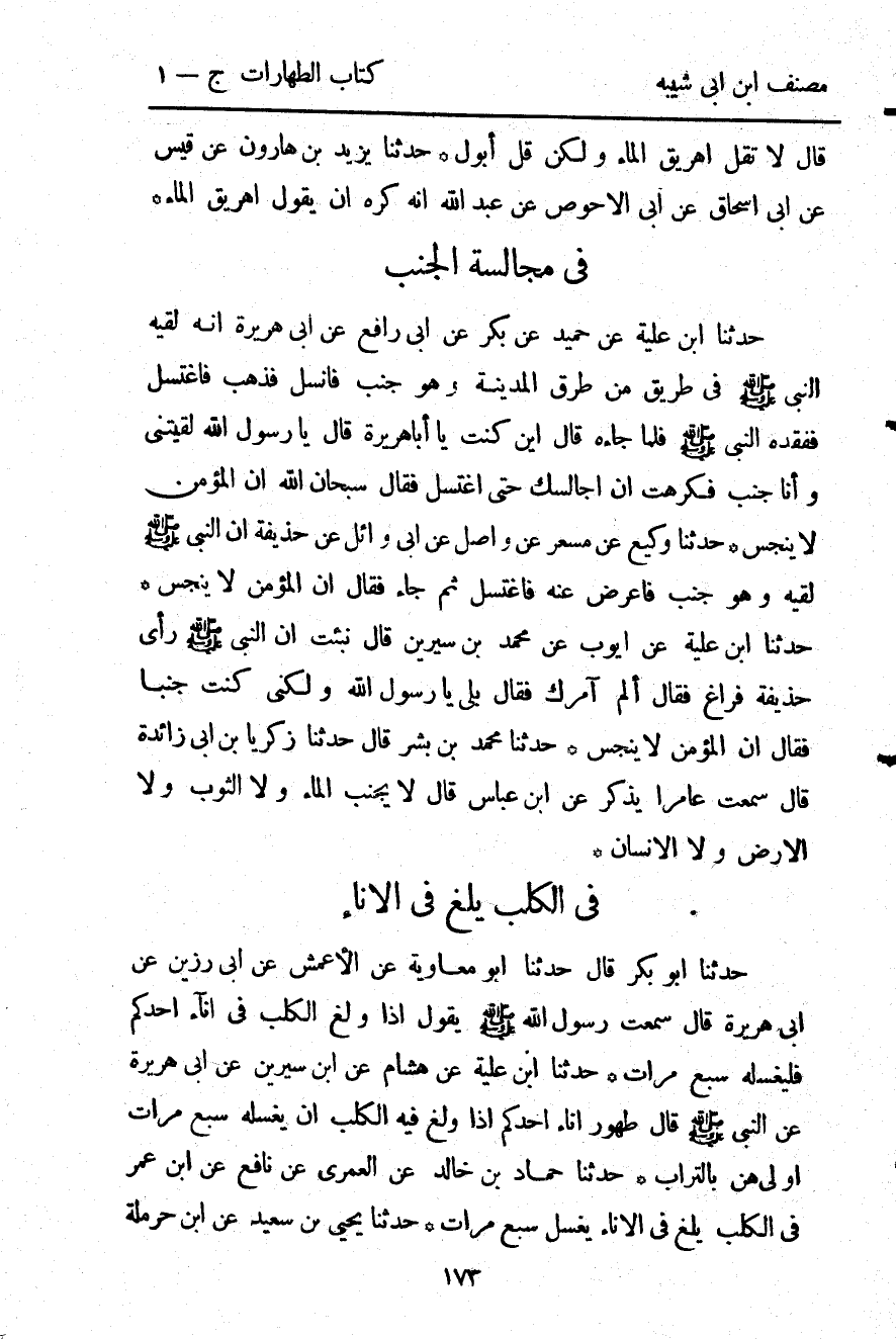 1837- حَدَّثَنَا ابْنُ عُلَيَّةَ ، عَنْ أَيُّوبَ ، عَنْ مُحَمَّدِ بْنِ سِيرِينَ ، قَالَ : نُبِّئْتُ أَنَّ النَّبِيَّ صلى الله عليه وسلم رَأَى حُذَيْفَةَ فَرَاغَ فَقَالَ : أَلَمْ أَرَك ؟ فَقَالَ : بَلَى يَا رَسُولَ اللهِ ، وَلَكِنِّي كُنْتُ جُنُبًا ، فَقَالَ : إنَّ الْمُؤْمِنَ لاَ يَنْجُسُ.