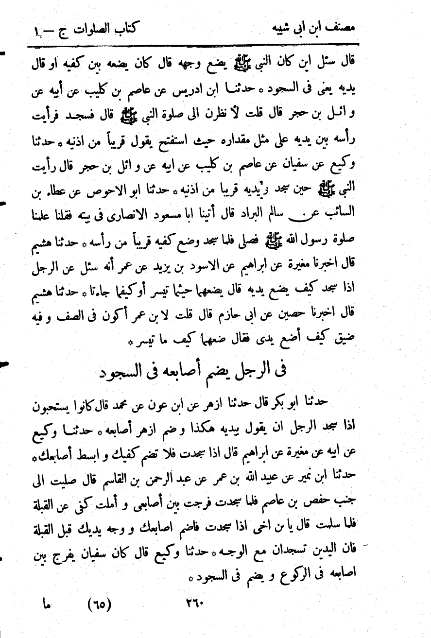 2688- حَدَّثَنَا ابْنُ نُمَيْرٍ ، عَنْ عُبَيْدِ اللهِ بْنِ عُمَرَ ، عَنْ عَبْدِ الرَّحْمَنِ بْنِ الْقَاسِمِ ، قَالَ : صَلَّيْت إلَى جَنْبِ حَفْصِ بْنِ عَاصِمٍ ، فَلَمَّا سَجَدْت فَرَّجْت بَيْنَ أَصَابِعِي وَأَمَلْت كَفِّي عَنِ الْقِبْلَةِ ، فَلَمَّا سَلَّمْت ، قَالَ : يَا ابْنَ أخِي ، إذَا سَجَدْت فَاضْمُمْ أَصَابِعَك ، وَوَجِّهْ يَدَيْك قِبَلَ الْقِبْلَةِ ، فَإِنَّ الْيَدَيْنِ تَسْجُدَانِ مَعَ الْوَجْهِ.