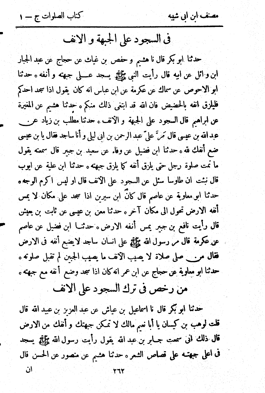 2710- حَدَّثَنَا ابْنُ فُضَيْلٍ ، عَنْ عَاصِمٍ ، عَنْ عِكْرِمَةَ ، قَالَ : مَرَّ رَسُولُ اللهِ صلى الله عليه وسلم عَلَى إنْسَانٍ سَاجِدٍ ، لاَ يَضَعُ أَنْفَهُ فِي الأَرْضِ ، فَقَالَ : مَنْ صَلَّى صَلاَةً لاَ يُصِيبُ الأَنْفُ مَا يُصِيبُ الْجَبِينُ لَمْ تُقْبَلْ صَلاَتُهُ.