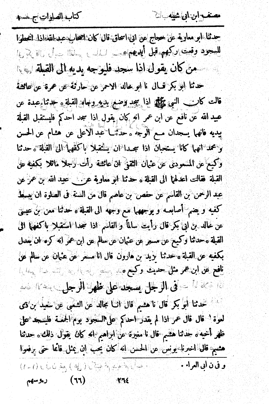 2732- حَدَّثَنَا مَعْنُ بْنُ عِيسَى ، عَنْ خَالِدِ بْنِ أَبِي بَكْرٍ ، قَالَ : رَأَيْتُ سَالِمًا ، وَالْقَاسِمَ إذَا سَجَدَا اسْتَقْبَلاَ بِأَكُفِّهِمَا إلَى الْقِبْلَةِ.