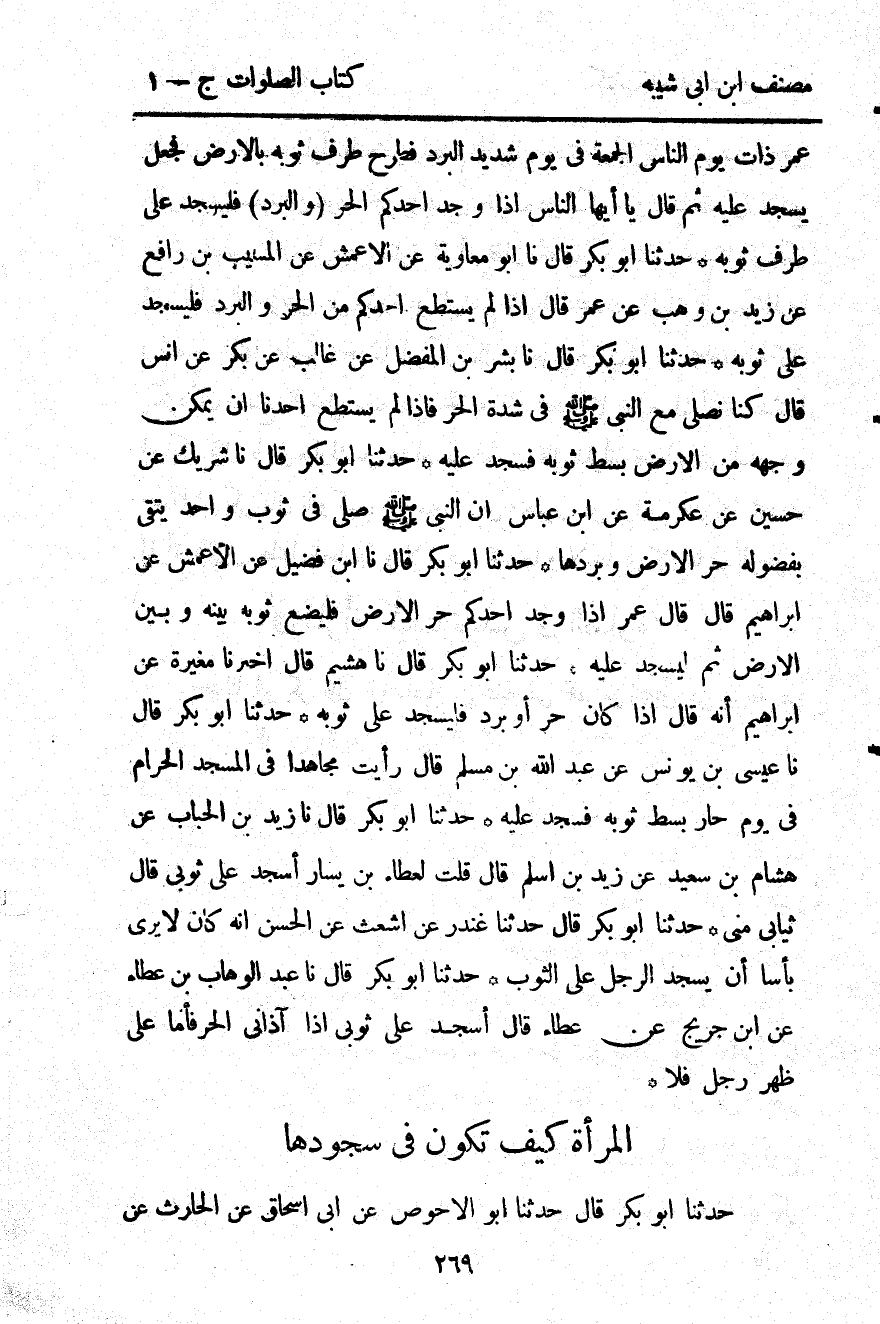 2787- حَدَّثَنَا ابْنُ فُضَيْلٍ ، عَنِ الأَعْمَشِ ، عَنْ إبْرَاهِيمَ ، قَالَ : قَالَ عُمَرُ : إذَا وَجَدَ أَحَدُكُمْ حَرَّ الأَرْضِ ، فَلْيَضَعْ ثَوْبَهُ بَيْنَهُ وَبَيْنَ الأَرْضِ ، ثُمَّ لْيَسْجُدْ عَلَيْهِ.