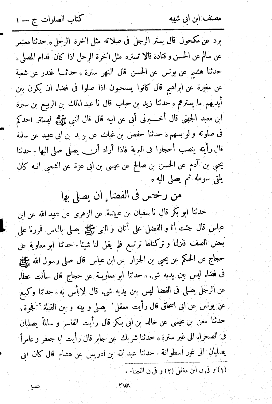 2883- حَدَّثَنَا أَبُو مُعَاوِيَةَ ، عَنْ حَجَّاجٍ ، عَنِ الْحَكَمِ ، عَنْ يَحْيَى بْنِ الْجَزَّارِ ، عَنِ ابْنِ عَبَّاسٍ ، قَالَ : صَلَّى رَسُولُ اللهِ صلى الله عليه وسلم فِي فَضَاءٍ لَيْسَ بَيْنَ يَدَيْهِ شَيْءٌ.